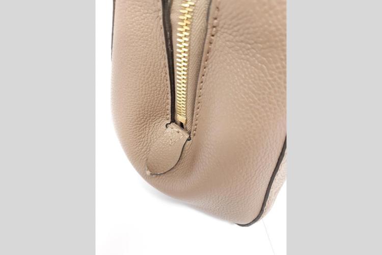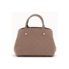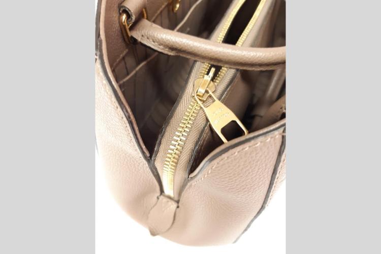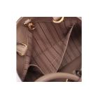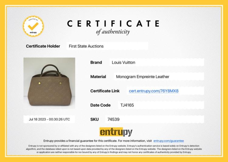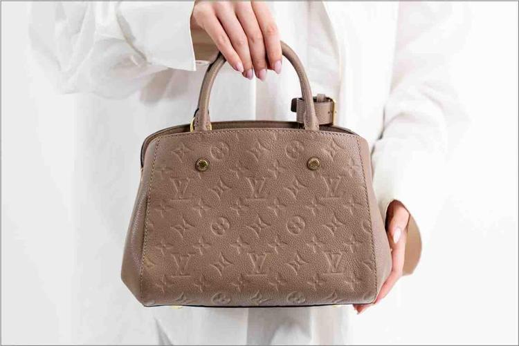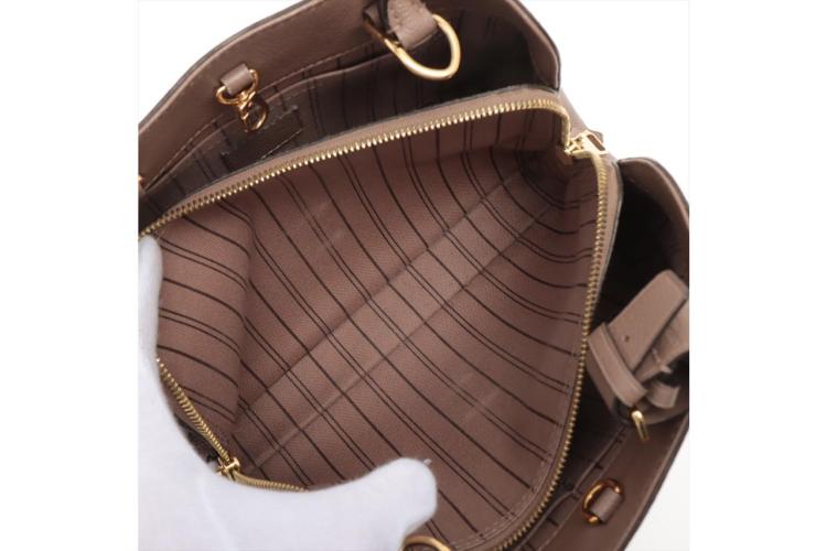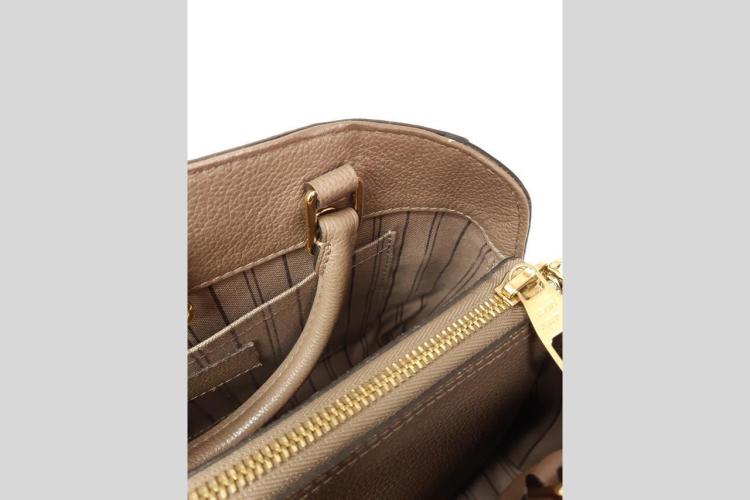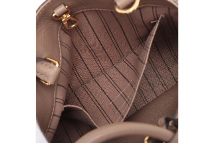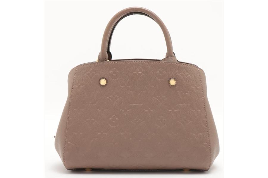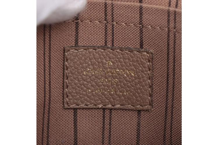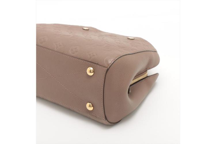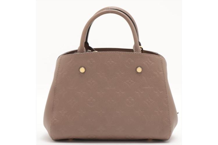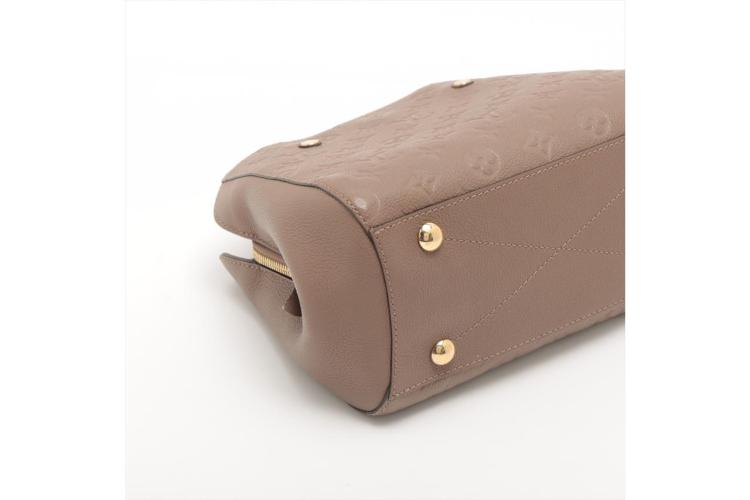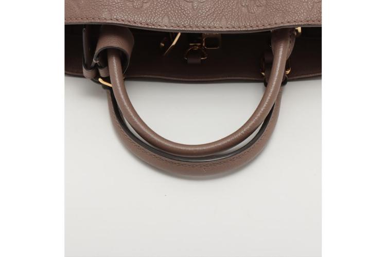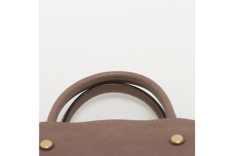 Louis Vuitton Montaigne BB handbag in taupe Monogram-embossed Empreinte leather. Featuring leather top handles, gold-toned hardware, hook closure on top. The top opens to a fabric lining interior with 3 compartments, centre one with zip closure. Approximate dimensions: 29cm (L) x 20cm (H) x 13cm (D), 9cm handle drop, and 55cm detachable strap drop. Accompanied by LV padlock, keys, clochette, handle belts. With Entrupy Certificate of Authenticity. (Pre-owned)