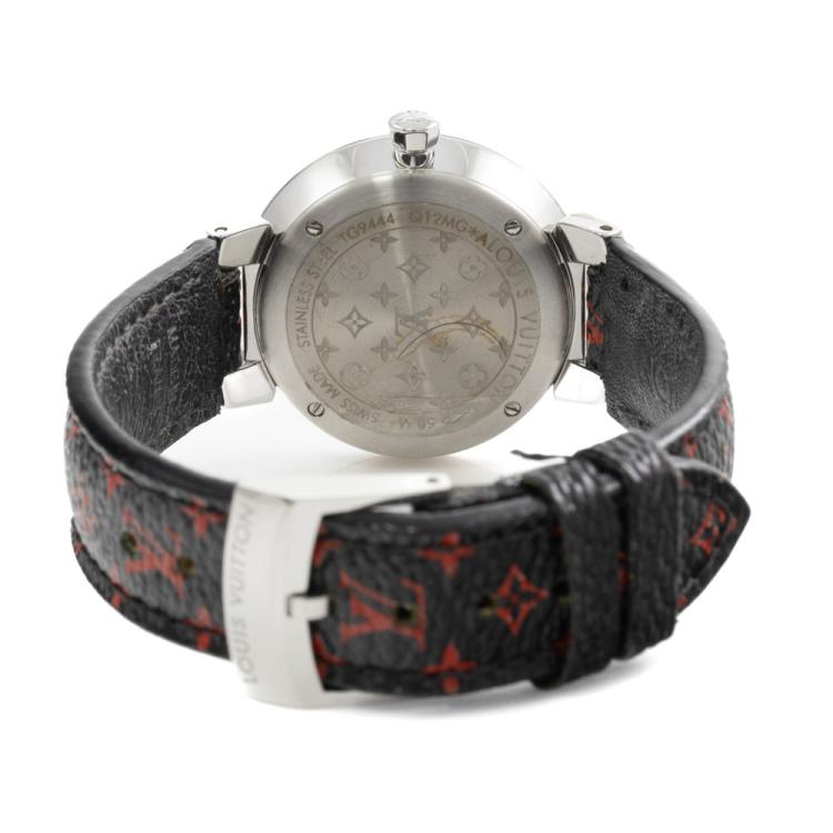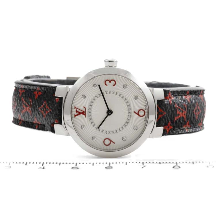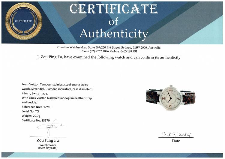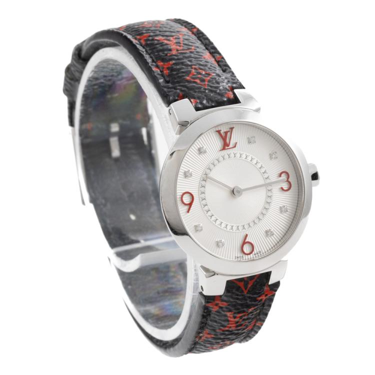 Louis Vuitton Tambour stainless steel quartz ladies watch. Silver dial, Diamond indicators, case diameter: 28mm, strap length: 17.5cm, Swiss made. Ref# Q12MG. With Louis Vuitton black/red monogram leather strap and buckle. With Certificate of Authenticity. 3 month FSA warranty. (Pre-owned)