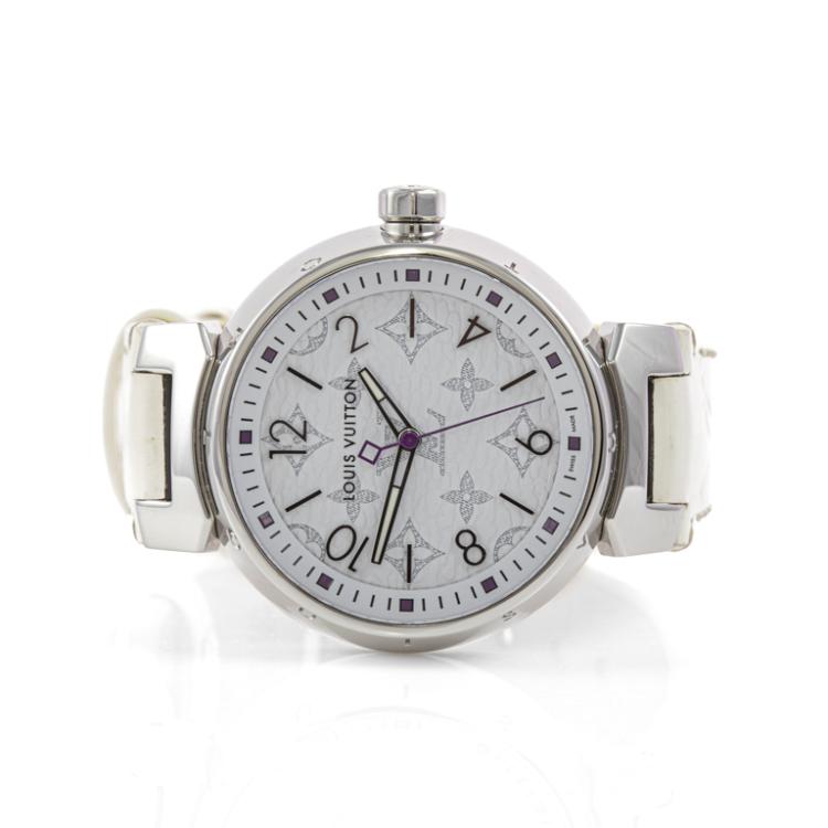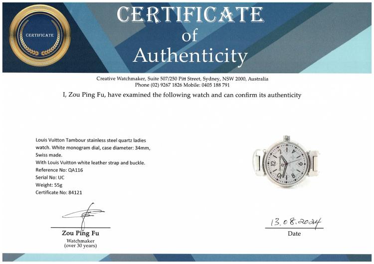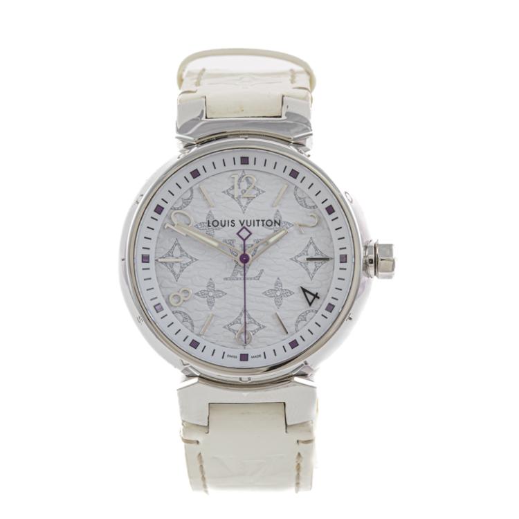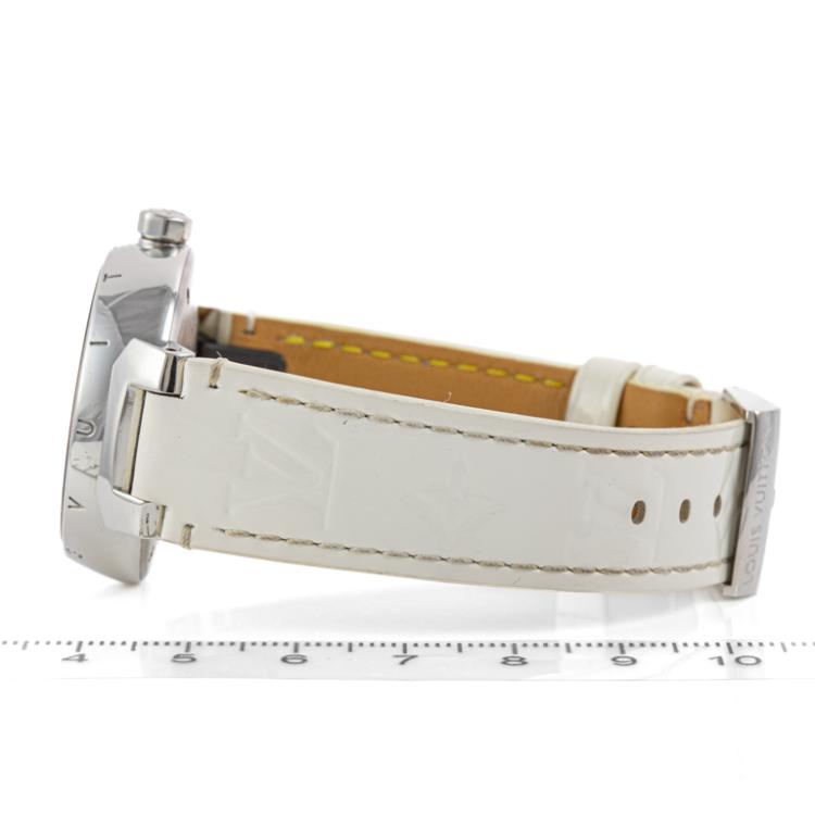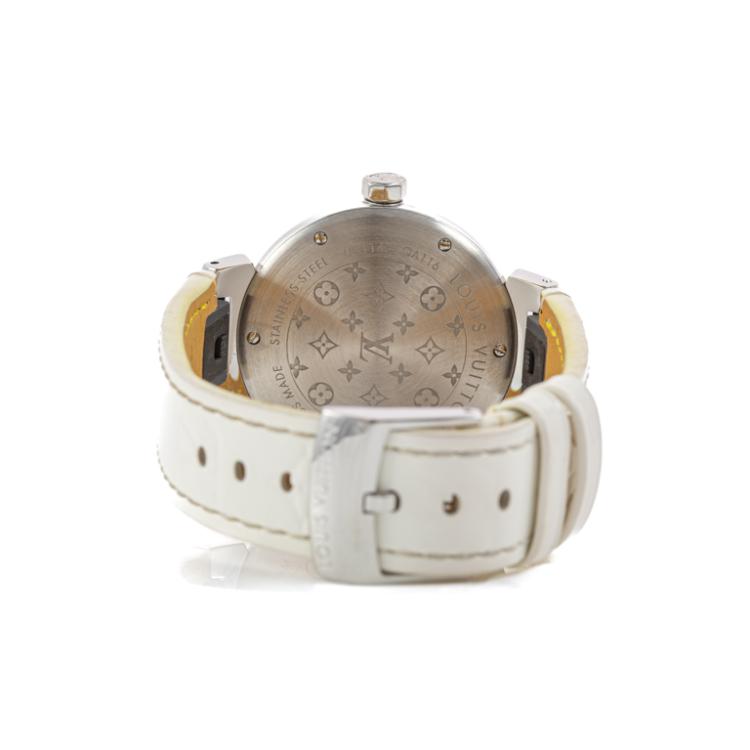 Louis Vuitton Tambour stainless steel quartz ladies watch. White monogram dial, case diameter: 34mm, strap length: 18cm, Swiss made. Ref# QA116. With Louis Vuitton white leather strap and buckle. With Certificate of Authenticity, Louis Vuitton International Guarantee Booklet dated 11/01/2020 and Louis Vuitton box. 3 month FSA warranty. (Pre-owned)