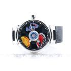 Louis Vuitton Tambour World Tour stainless steel quartz men's watch. Black dial, case diameter: 41mm, Strap length: 20.5cm Swiss made. Ref# QA063. With Louis Vuitton Black leather strap and buckle. With Certificate of Authenticity and Louis Vuitton box. 3 month FSA warranty (Pre-owned)