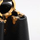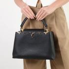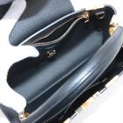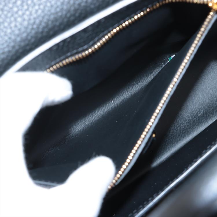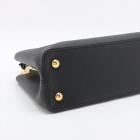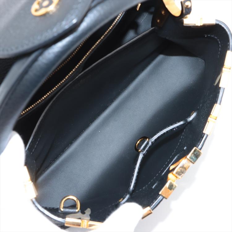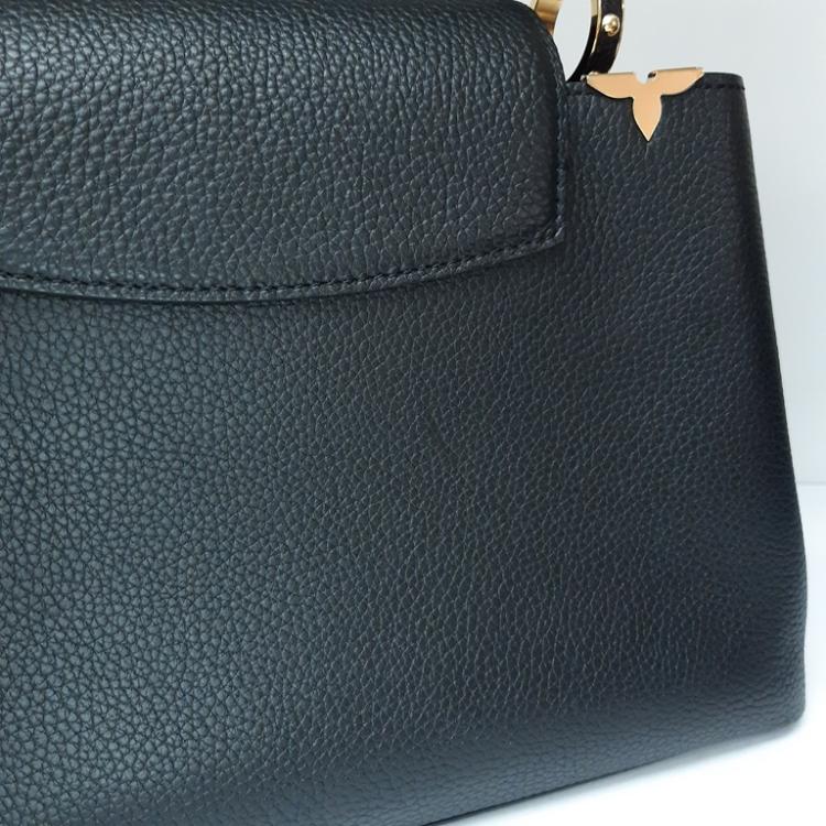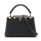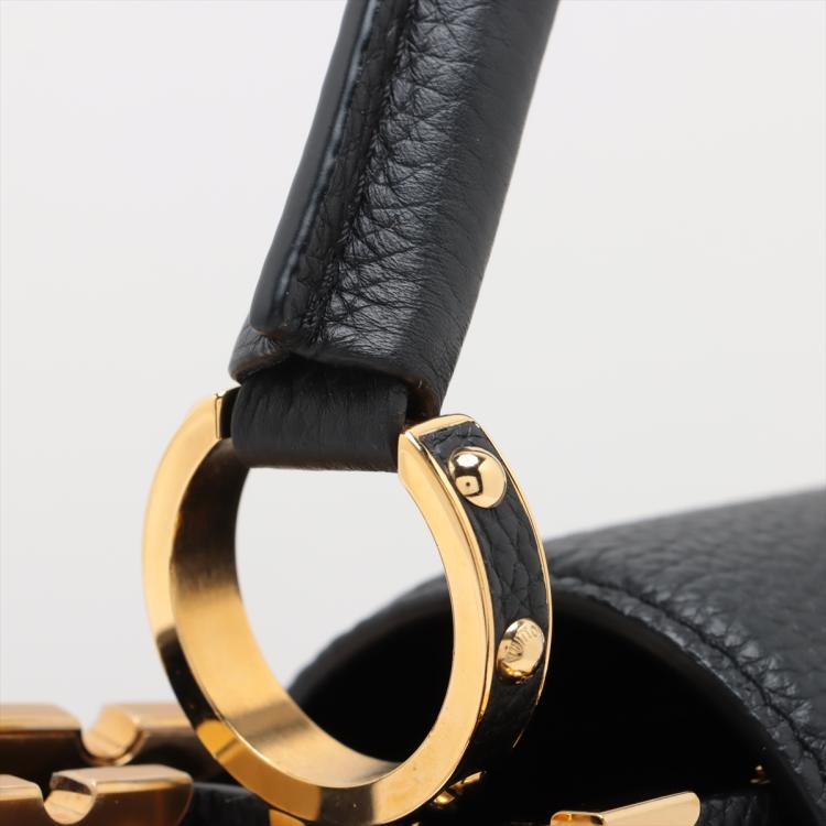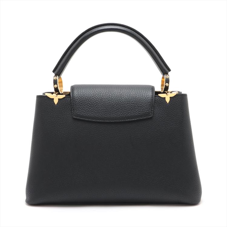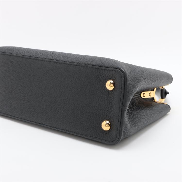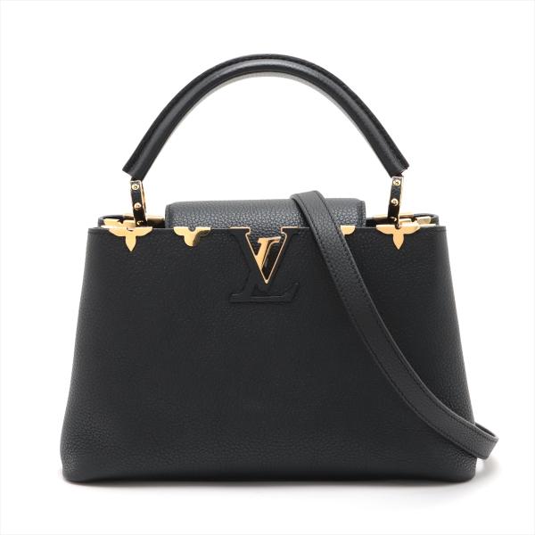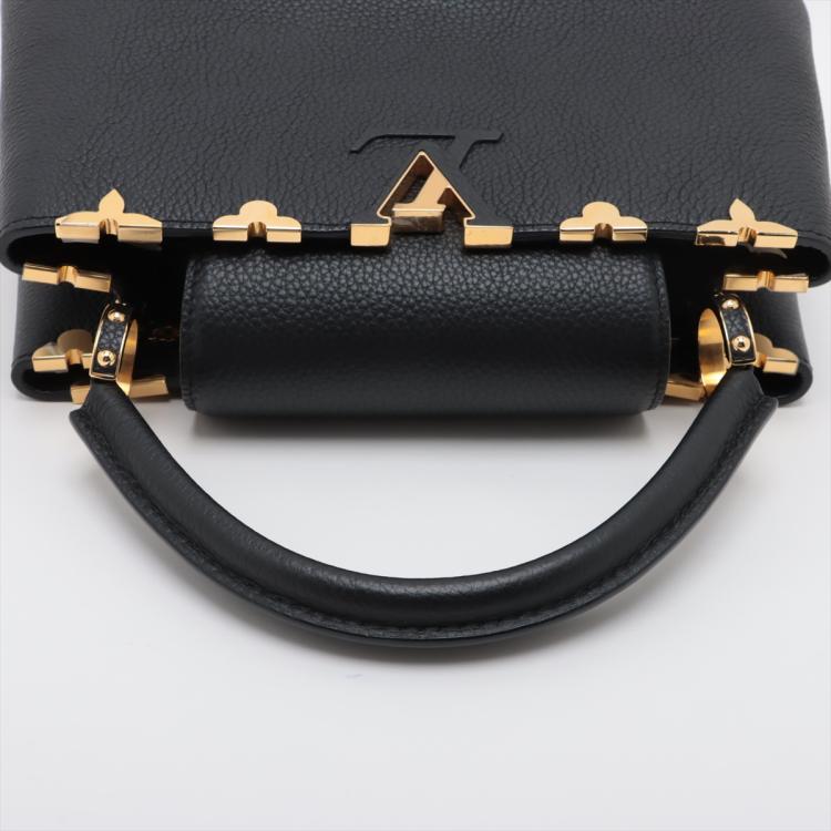 Louis Vuitton Taurillon Capucines MM in black Taurillon leather. Featuring metallic Monogram flowers details on top, single leather handle, gold-tone hardware. Flap and snap hook closures opens to black leather lining interior with 2 large compartments with a zipper pocket. Approximate dimensions: 31cm(Base-L) x 20cm(H) x 11cm(D), 10.5cm handle drop and 52-56cm detachable strap drop. Accompanied by LV dust bags and box. With Entrupy Certificate of Authenticity. (Pre-owned)