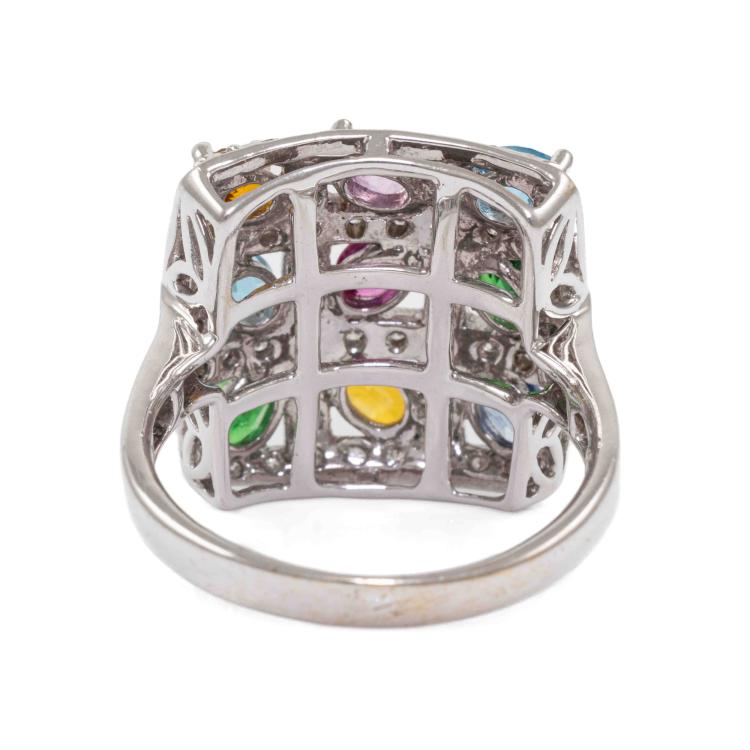 Mixed gemstone ring with oval shape multi-coloured Natural Sapphires totalling 0.90ct, an oval shape Natural Ruby of 0.10ct, oval shape Natural blue Topaz totalling approximately 0.40ct, oval shape Natural Emeralds totalling approximately 0.30ct and round Natural Diamonds totalling 0.30ct (Estimated grading: H SI). 18ct white gold. Ring size N. Band Width: 2.5 - 3.1mm. Weight: 7.1g. (Prre-owned)