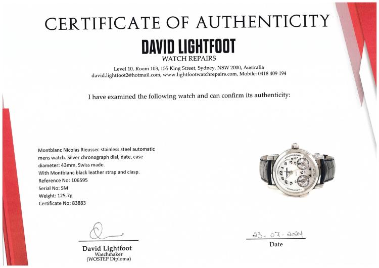 Montblanc Nicolas Rieussec stainless steel automatic mens watch. Silver chronograph dial, date, case diameter: 43mm, adjustable max wrist size: 18cm, Swiss made. Ref# 106595. With Montblanc black leather strap and clasp. With Certificate of Authenticity, Montblanc International Guarantee Certificate booklet dated 08/03/2014 and Montblanc box. 3 month FSA warranty (Pre-owned)