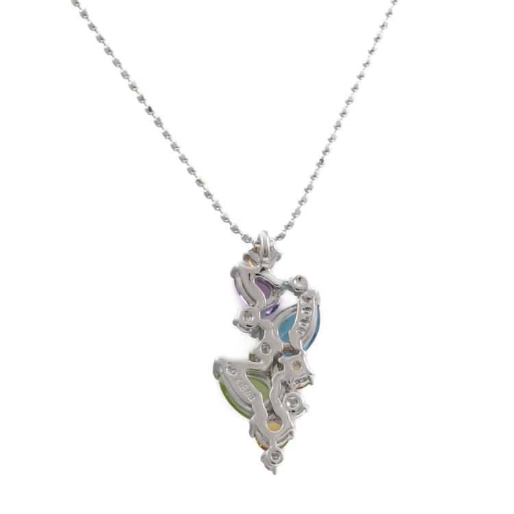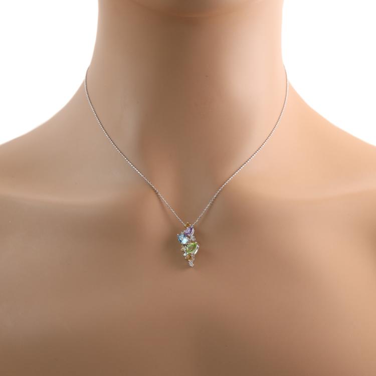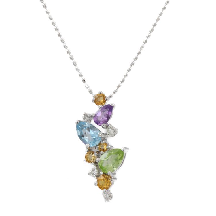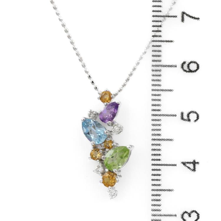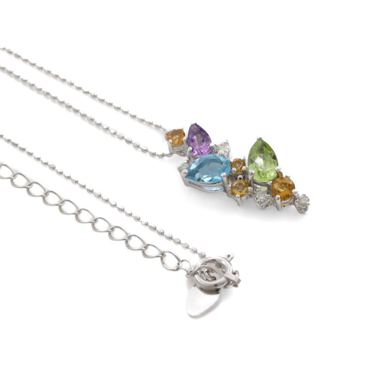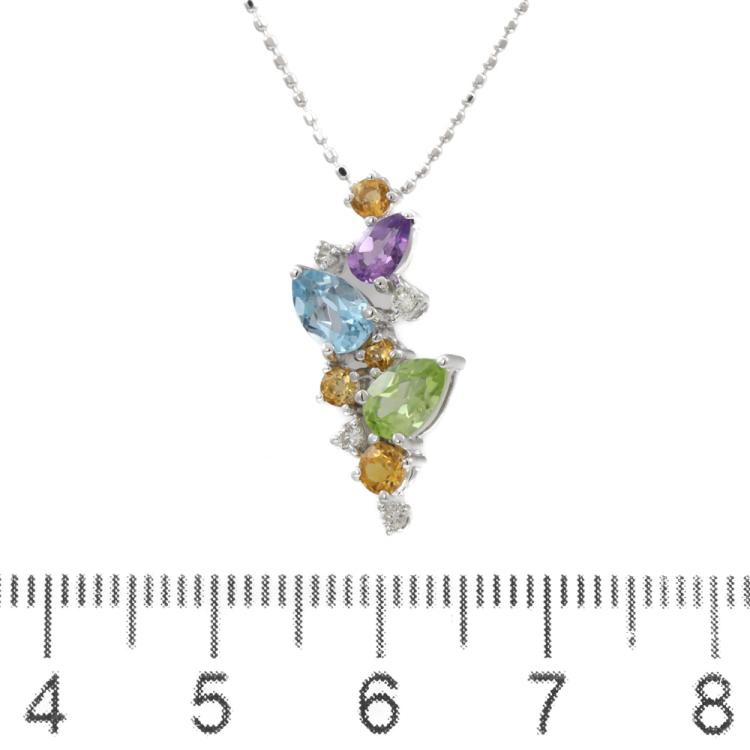 Multi-colour Gemstones and Diamond pendant with pear shape Natural Gemstones (including Topaz, Peridot and Amethyst) totalling approximately 0.90ct, round Natural Citrine totalling 0.25ct and round Natural Diamonds totalling 0.07ct. 18ct white gold with 45cm 18ct white gold adjustable chain. Weight: 4.0g. (Pre-owned)