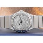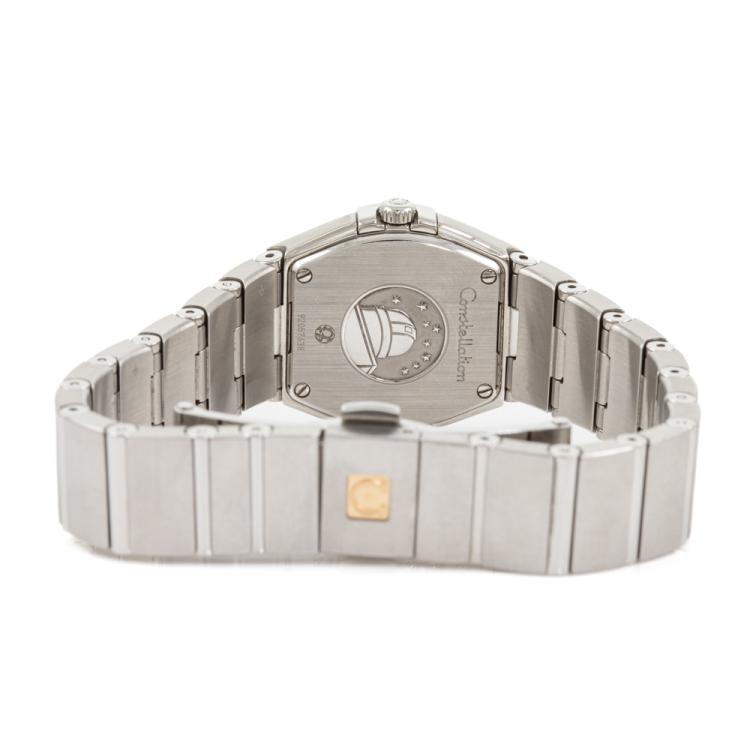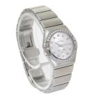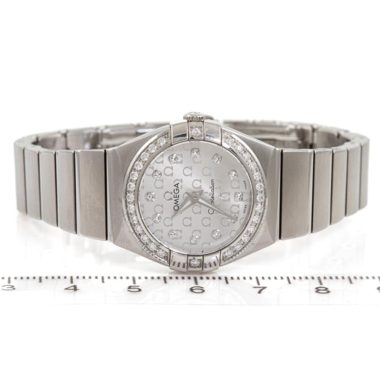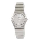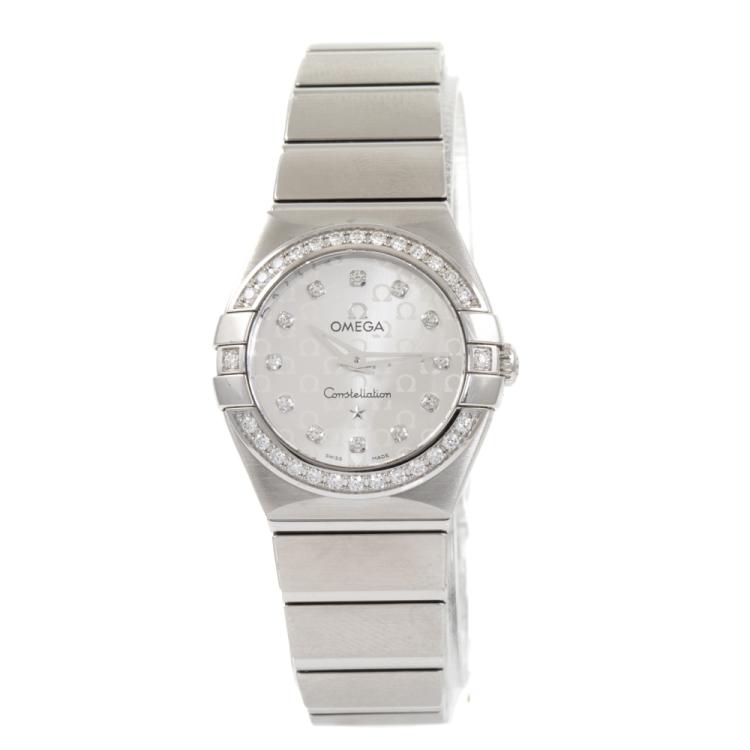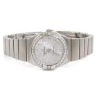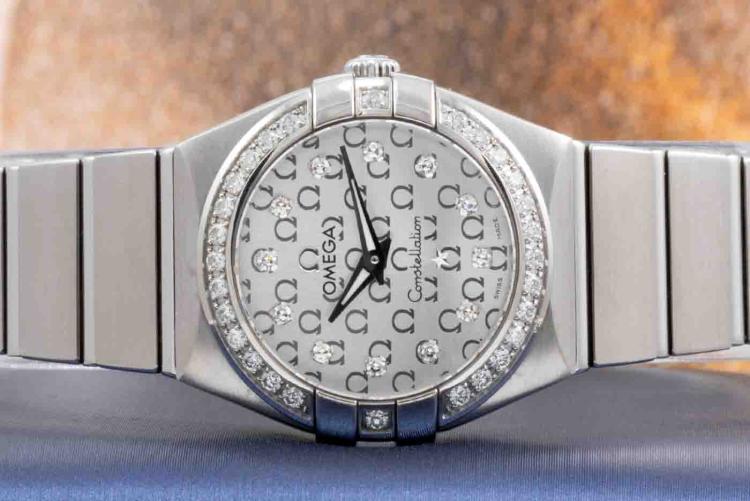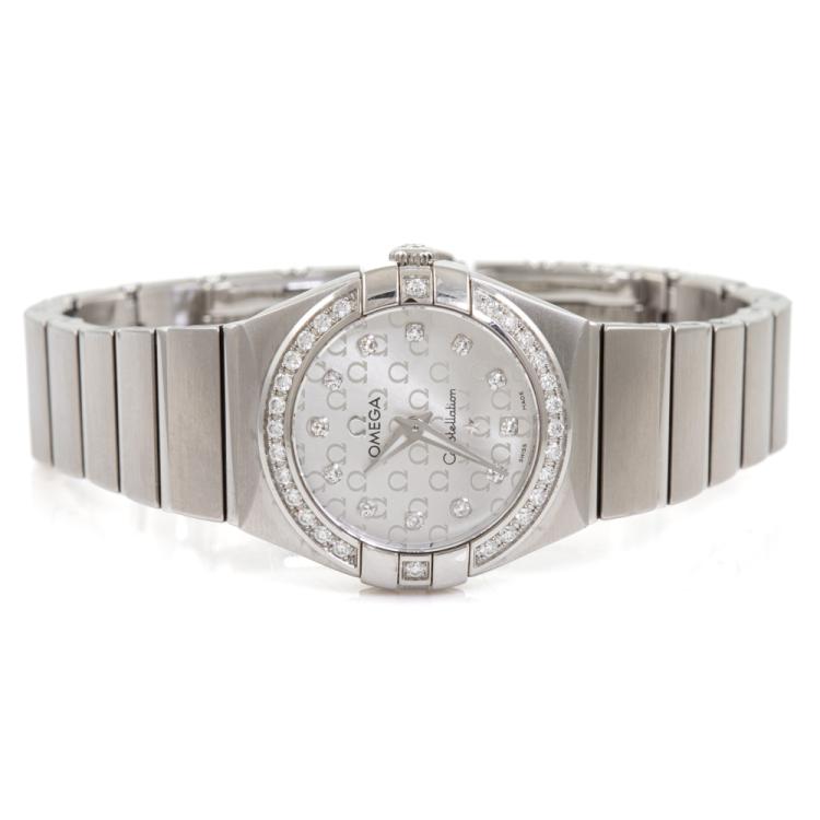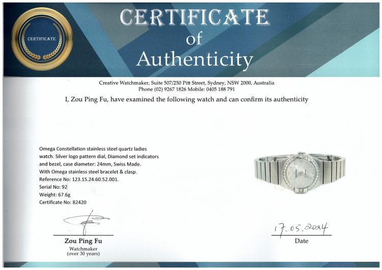 Omega Constellation stainless steel quartz ladies watch. Silver logo pattern dial, Diamond set indicators and bezel, case diameter: 24mm, wrist size: 15.5cm, Swiss Made, Ref# 123.15.24.60.52.001. With Omega stainless steel bracelet & clasp. With Certificate of Authenticity, Omega International Warranty, Precious Stones Certificate & Pictograms card. With Omega box. 3 Months FSA Warranty. (Pre-owned)
