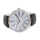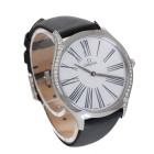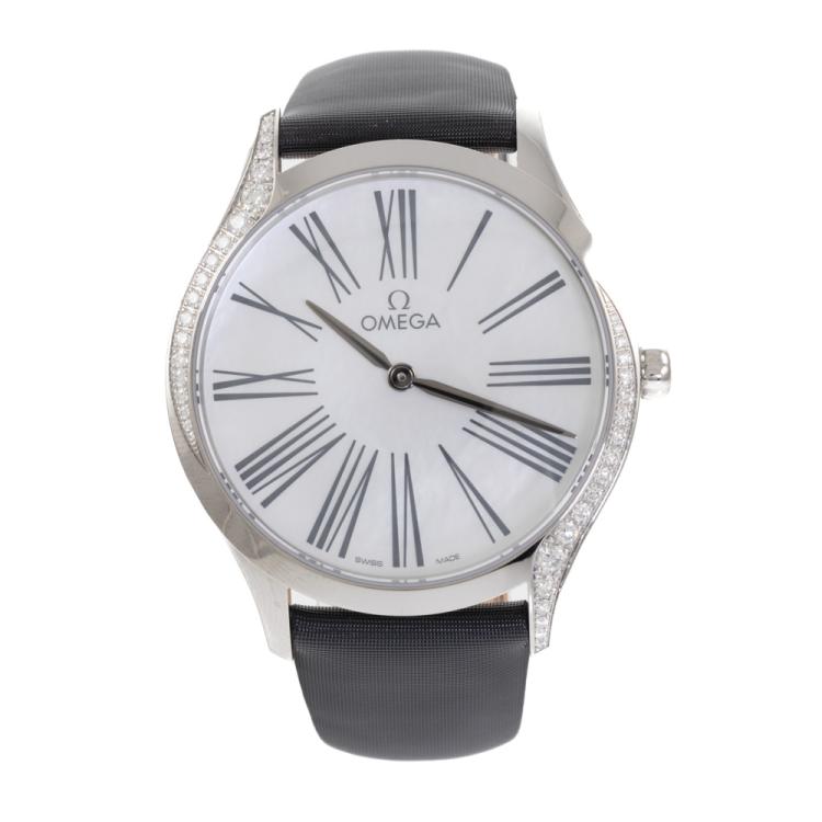 Omega De Ville Tresor stainless steel quartz watch. Silver dial, Diamond set bezel to lugs, case diameter: 36mm, strap length: 18cm, Swiss made. Ref# 428.17.36.60.05.001. With Omega black fabric strap and buckle. With FSA Certificate of Authenticity, Omega Precious Stones Certificate card, Pictograms card and Omega box. 3 month FSA warranty (AS new, Note: minor scuff on case and minor wear marks on strap due to being display stock)