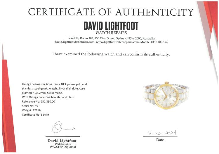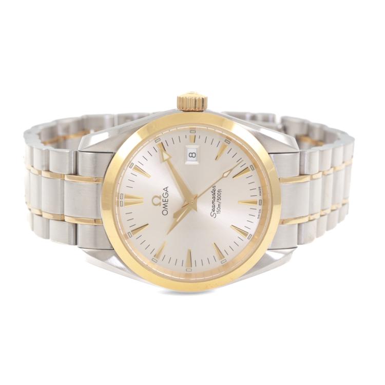 Omega Seamaster Aqua Terra 18ct yellow gold and stainless steel quartz watch. Silver dial, date, case diameter: 36.2mm, wrist size: 19.5cm, Swiss made. Ref# 2318.30.00. With Omega two-tone bracelet and clasp. With Certificate of Authenticity, Omega International Warranty card dated: 07/04/2007 and Omega Pictograms card. 3 month FSA warranty applies (Pre-owned)