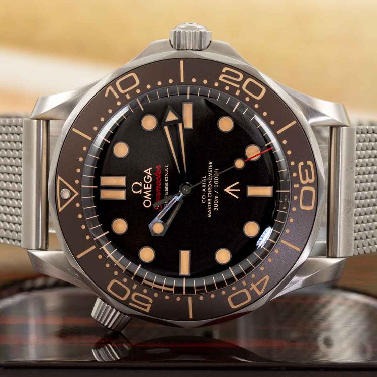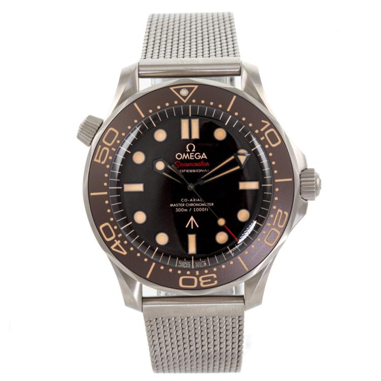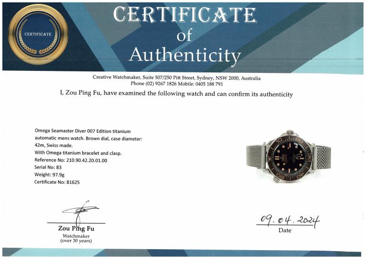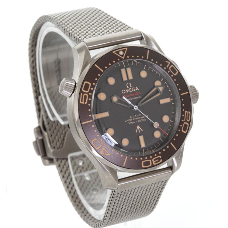 Omega Seamaster Diver 007 Edition titanium automatic mens watch. Brown dial, case diameter: 42m, adjustable max wrist size: 20.5cm, Swiss made. Ref# 210.90.42.20.01.00. With Omega titanium bracelet and clasp. With Certificate of Authenticity, Omega International Warranty card dated 11/01/2023, Omega Pictograms card, Omega Master Chronometer card and Omega case. Balance of 5 year Omega manufacturer warranty applies. (Pre-owned)
