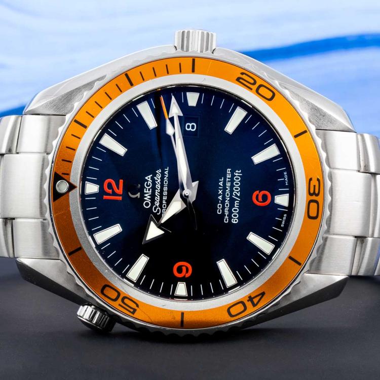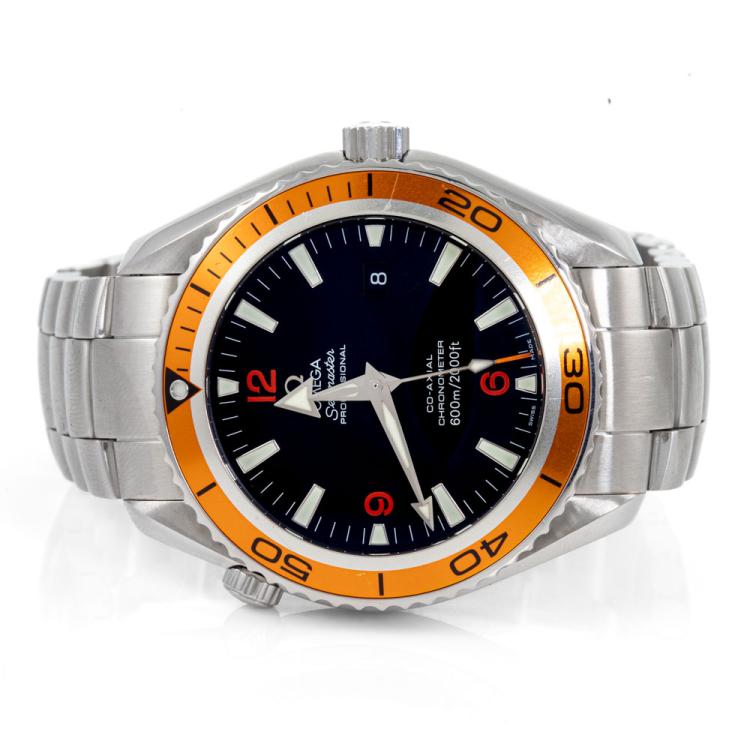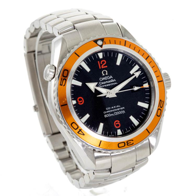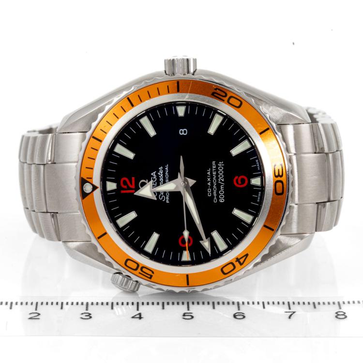 Omega Seamaster Planet Ocean stainless steel automatic mens watch. Black dial, date, case diameter: 45.5mm, wrist size: 19cm, Swiss made. Ref# 2208.50. With Omega stainless steel bracelet and clasp. With Certificate of Authenticity. 3 month FSA warranty (Pre-owned)