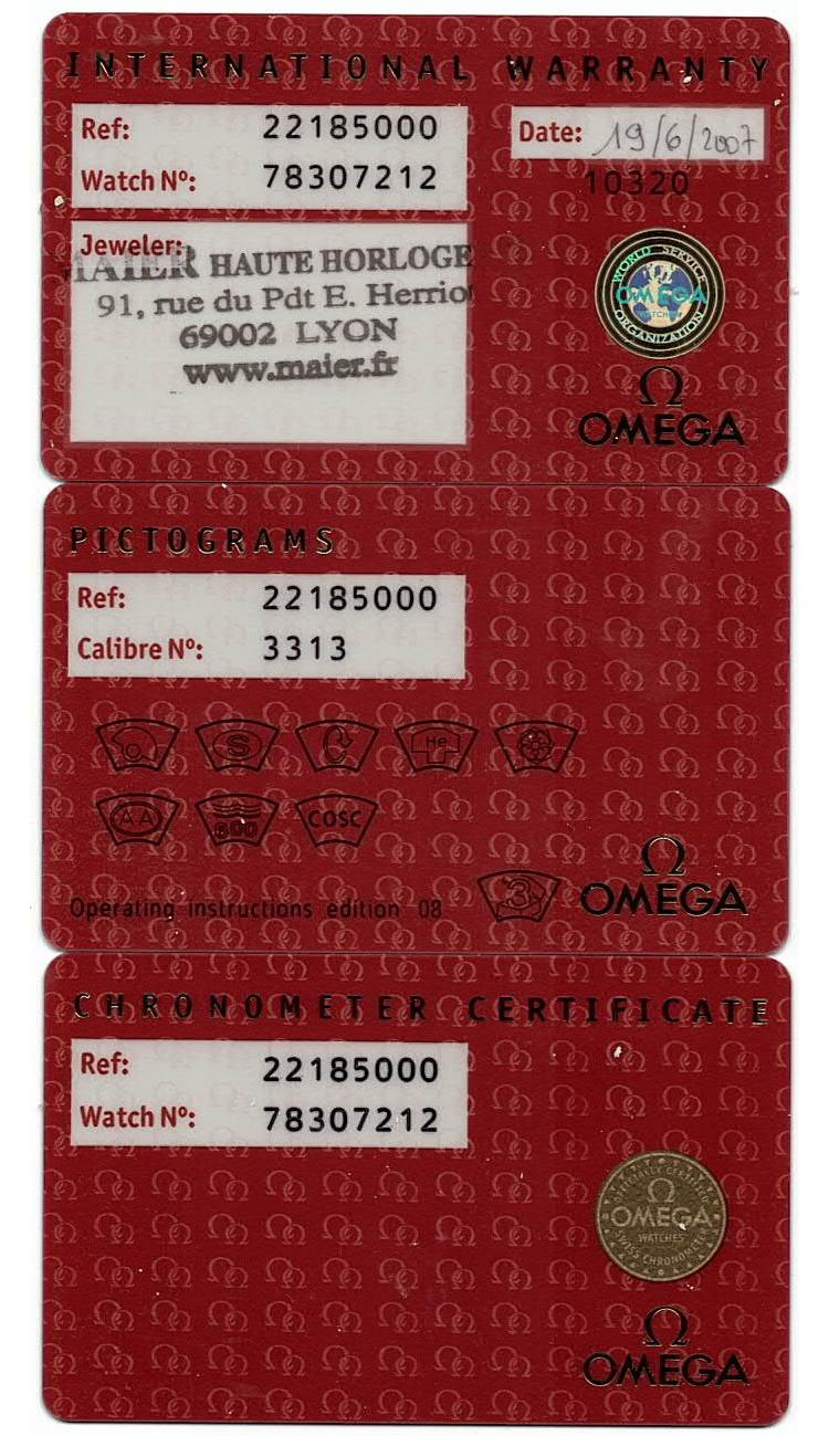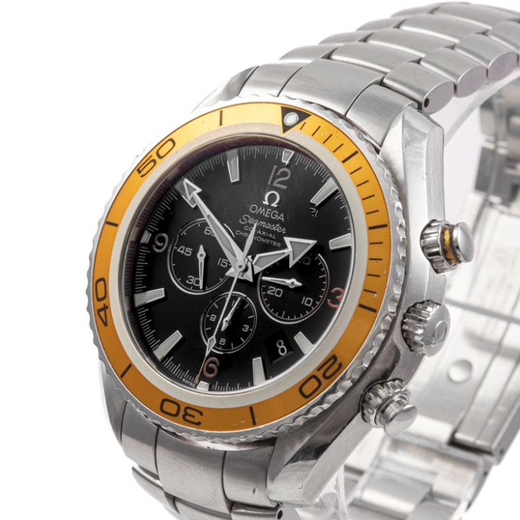 Omega Seamaster Planet Ocean stainless steel automatic mens watch. Black chronograph dial, date, case diameter: 45.5mm, wrist size: 21cm, Swiss made. Ref #2218.50. With Omega stainless steel bracelet and clasp. With Certificate of Authenticity, Omega International Warranty card dated 19/06/2007, Pictograms card, Chronometer certificate card and Omega box. 3 month FSA warranty. (Pre-owned)