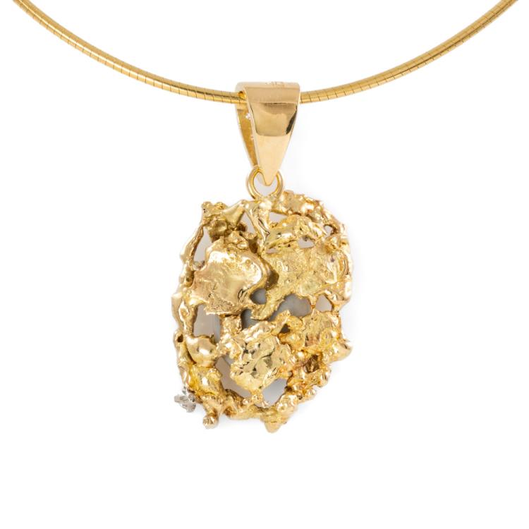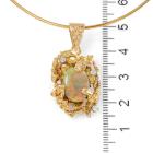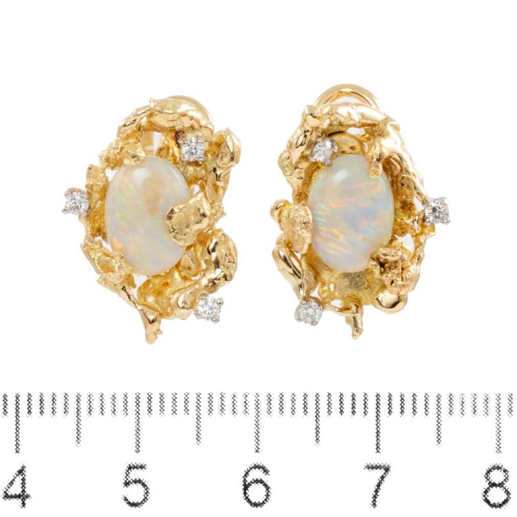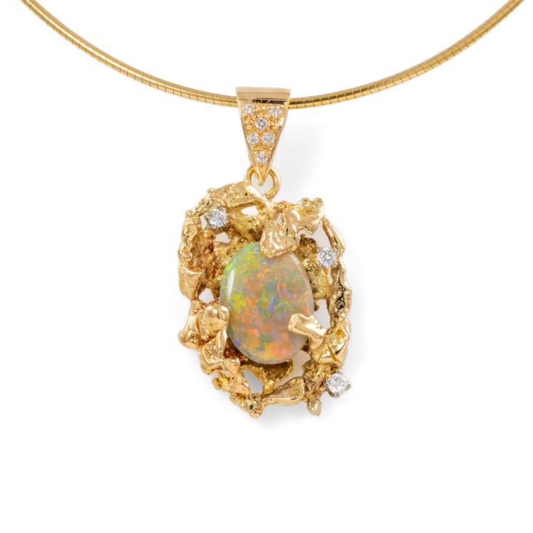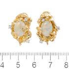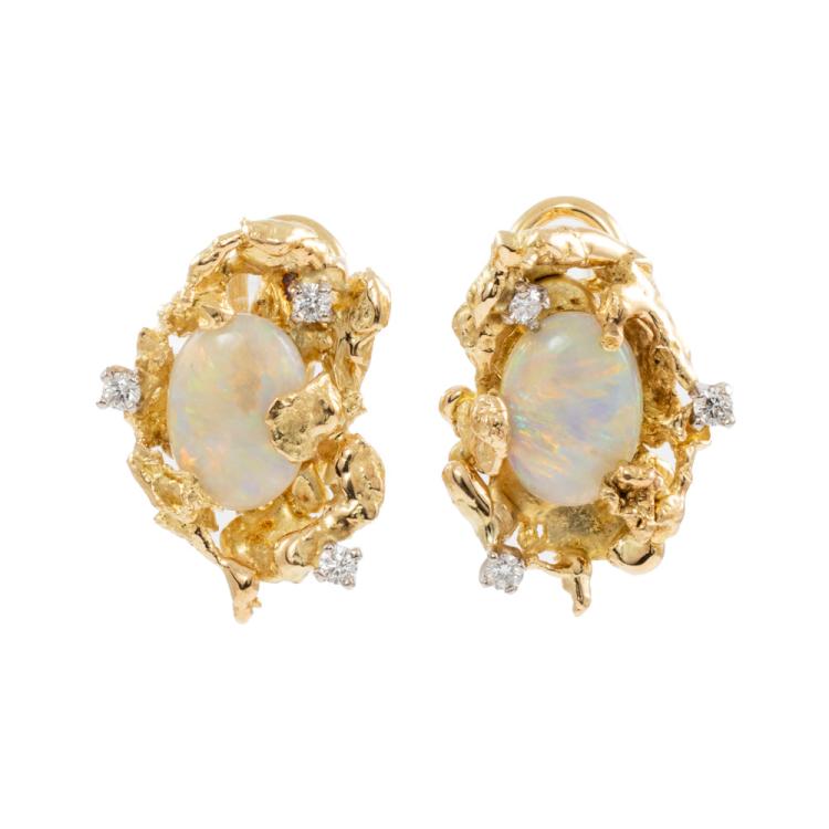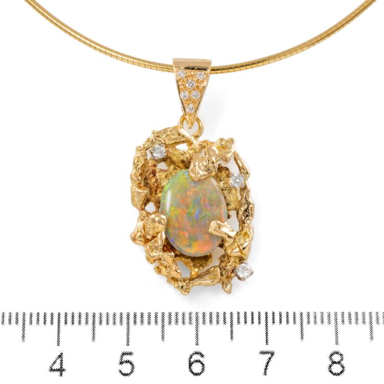 Opal & Diamond pendant and earrings set. 1) Pendant with oval cabochon cut natural solid White Opals of size 13mm x 10mm and round Natural Diamonds totalling approximately 0.15ct. Length: 40.5cm Omega chain. 2) Clip-on earrings (for pierced ears) with 2 natural solid White Opal of size 10mm x 7mm and round natural Diamonds totalling approximately 0.15ct. Both 18ct yellow gold. Total weight: 26.1g. (Pre-owned)