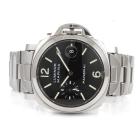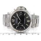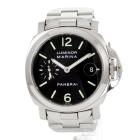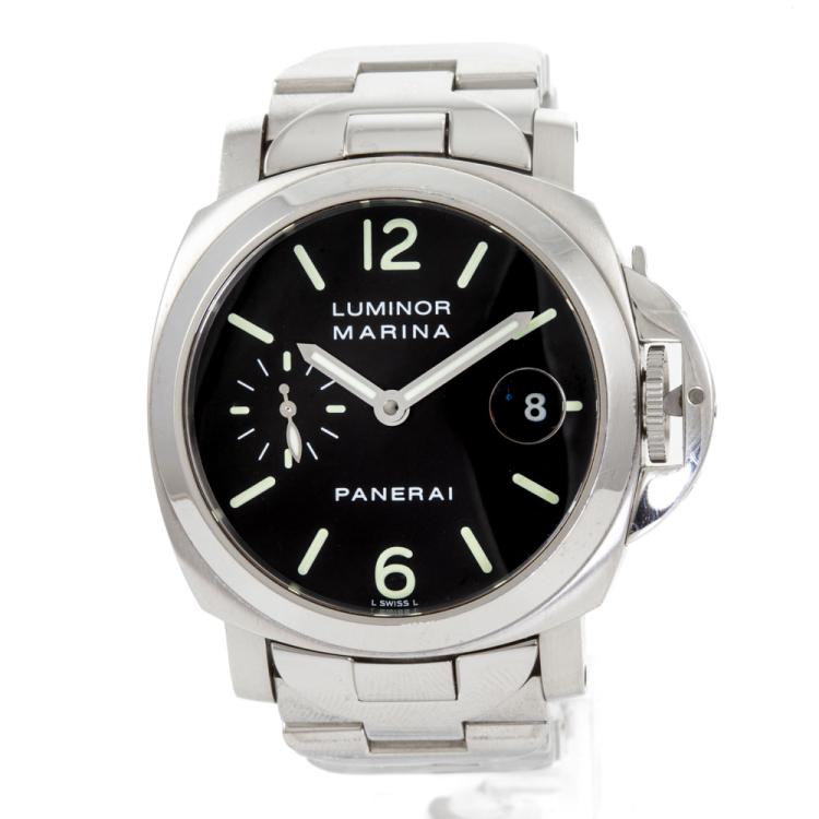 Panerai Luminor Marina stainless steel automatic mens watch. Black dial, small second, date, case diameter: 40mm, wrist size: 15.5cm, Swiss made. Ref# PAM00050. With Panerai stainless steel bracelet and clasp. With Certificate of Authenticity, Undated Panerai International guarantee certificate card and Panerai box. 3 month FSA warranty (Pre-owned)