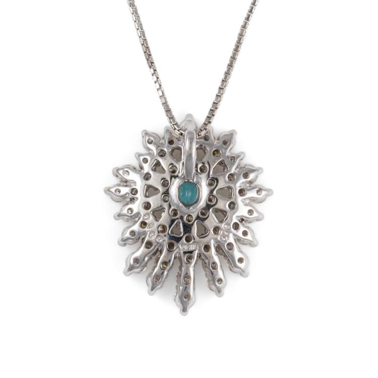 Tourmaline and Diamond pendant with an oval natural Paraiba Tourmaline of 0.08ct and round natural Diamonds totalling 1.00ct (Estimated grading: G-J VS-SI). 18ct white gold with 40cm 18ct white gold chain. Weight: 5.0g. (Pre-owned)