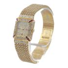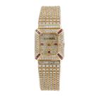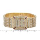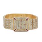 Patek Philippe vintage 18ct yellow gold manual winding watch. Diamond set dial with 3 Ruby indicators. Diamond set bezel with carre cut Rubies on corners. Carre cut Diamonds on the lugs. Total Diamond weight approx 7.50ct (Est grading G-H SI). Case diameter: 20mm x 21.5mm, Swiss made. With Diamond set 18ct gold bracelet & clasp. With copy of J Farren Price service invoice dated 12/09/24. With Certificate of Authenticity, Patek case & J Farren Price 24mth warranty.(Pre-owned)