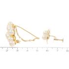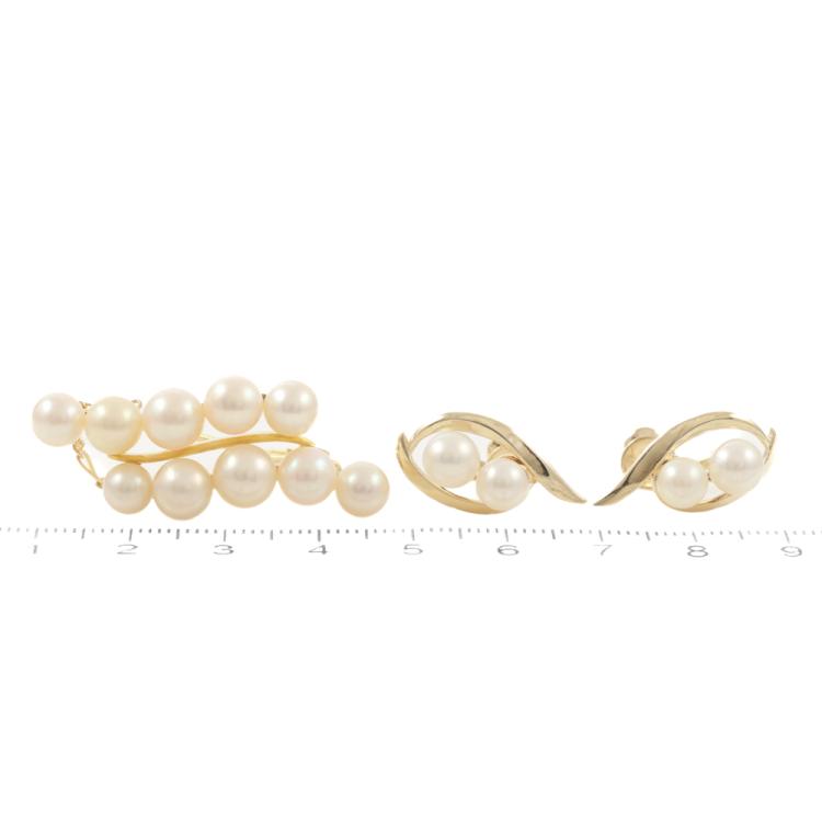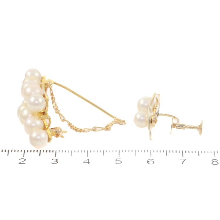 Pearl brooch and earring set. 1) Pearl brooch with 10 Cultured Pearls of 5.5mm - 7.1mm. 18ct yellow gold brooch and 14ct yellow gold (XRF tested, no stamp) safety chain. Size: 4cm x 1.5cm. 2) Pearl screwback clip-on earrings with 4 Cultured Pearl of 6.1mm - 5.6mm. 14ct yellow gold (XRF tested, no stamp). Total weight: 13.3g. (Pre-owned)