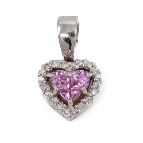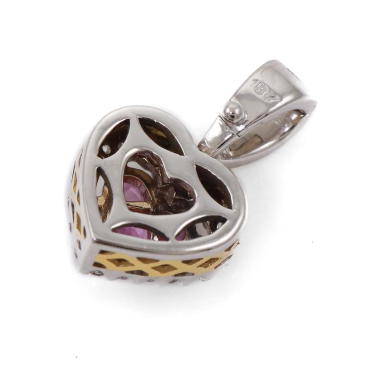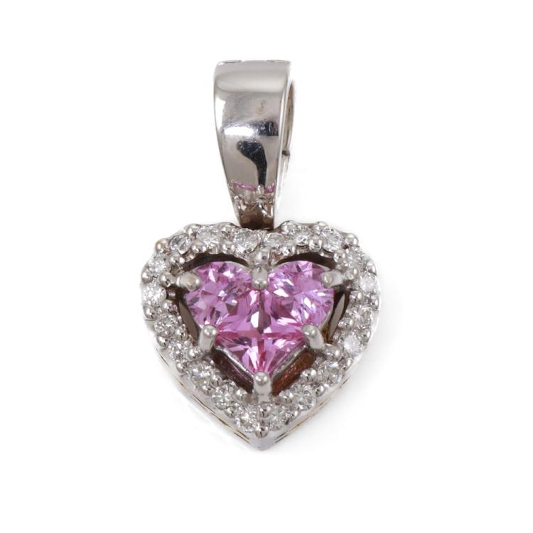 Sapphire and Diamond heart design enhancer pendant with invisible set one princess and two half moon cut pink Natural Sapphires totalling approximately 0.70ct and round Natural Diamonds totalling 0.20ct. 18ct yellow & white gold. No chain provided. Weight: 3.9g. (Pre-owned)