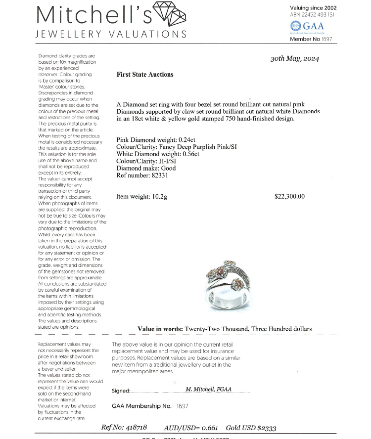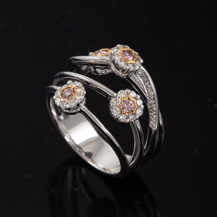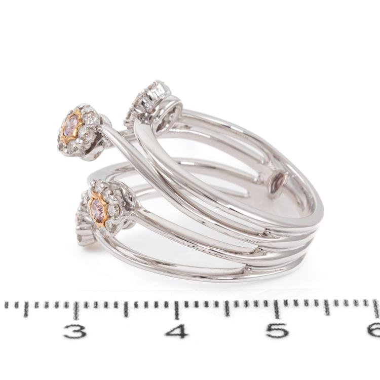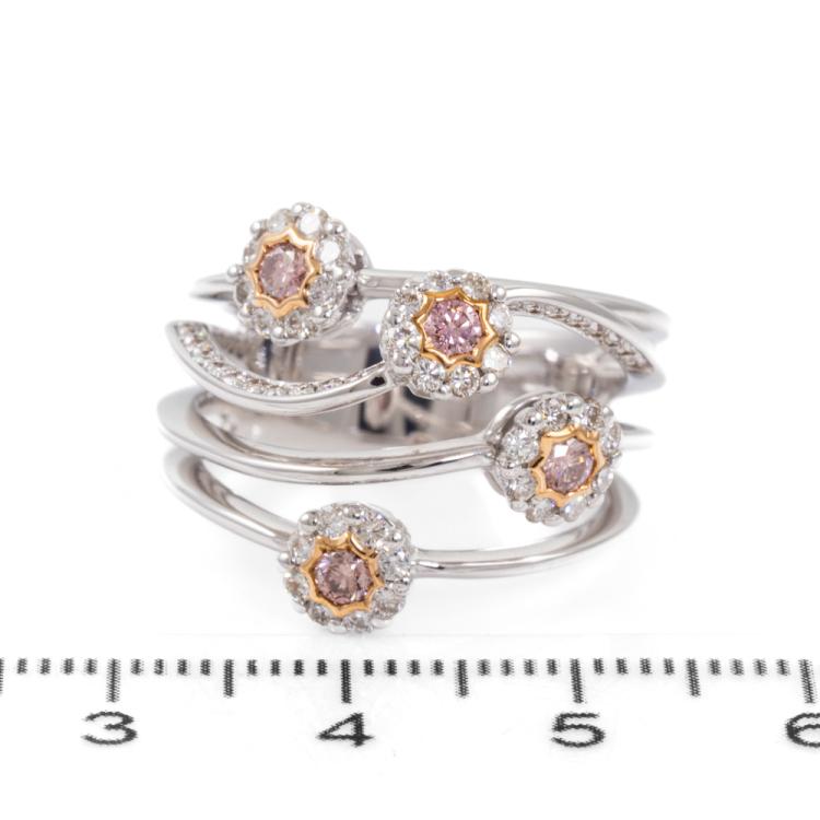 Diamond flower designed dress ring with 4 round natural Pink Diamonds totalling approximately 0.24cts (Estimated grading: Fancy Deep Purplish Pink SI) and round natural White Diamonds totalling approximately 0.56cts (Estimated grading: H-I SI). 18ct white and yellow gold. Ring size O 1/2 - ring resizing is not recommended. Band width: 6.0 - 7.5mm. Weight: 10.2g. With Valuation Certificate #418718. (Pre-owned)