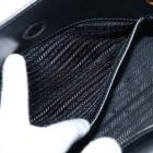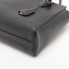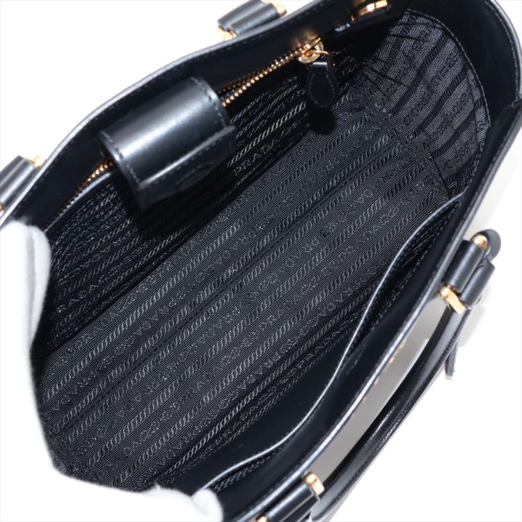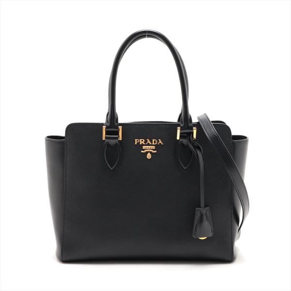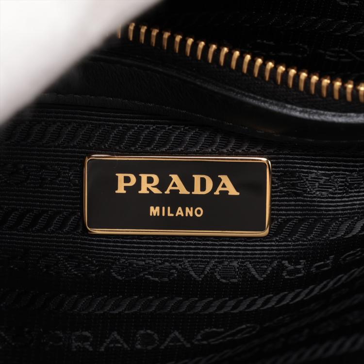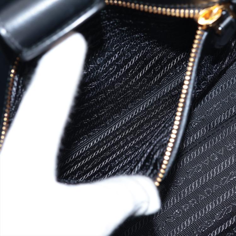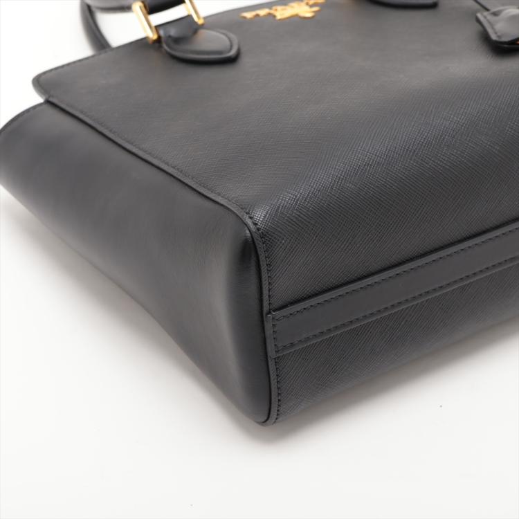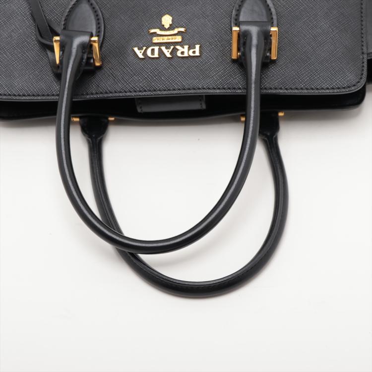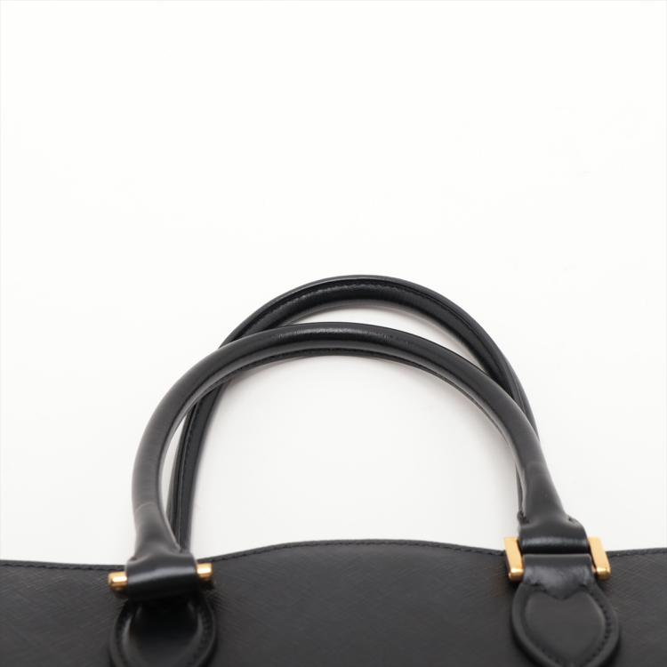 Prada tote bag in black Saffiano soft calfskin leather. Featuring rolled top handles, gold tone hardware, logo details at front. The top with magnetic button closure opens to a logo Jacquard nylon lining interior with zipper and patch pockets. Approximate dimensions: 26cm(W) x 21cm(H) x 10cm(D), 13cm handle drop, 54cm shoulder strap drop. Accompanied by a leather crochet & keyring, Prada certificate card and a dust bag. With Entrupy Certificate of Authenticity. (Pre-owned)