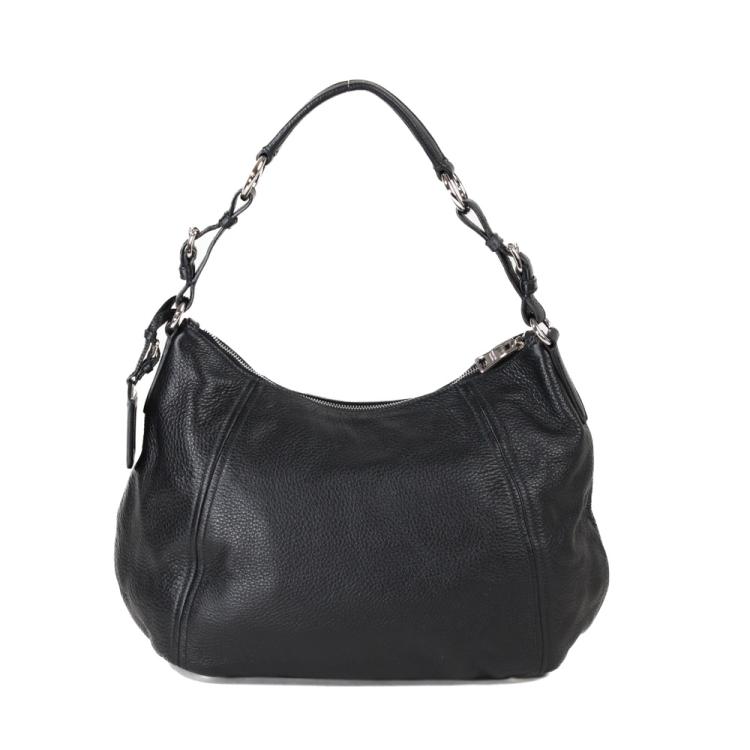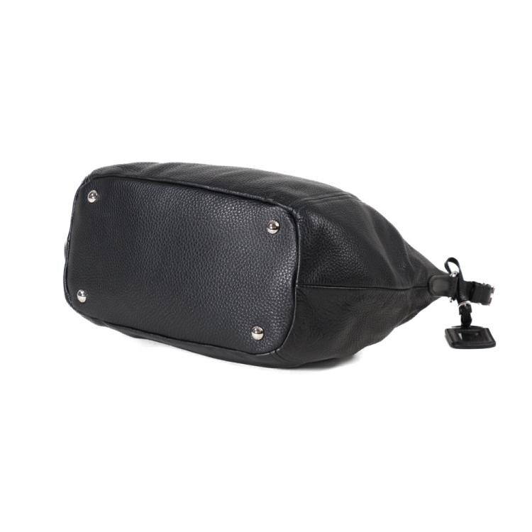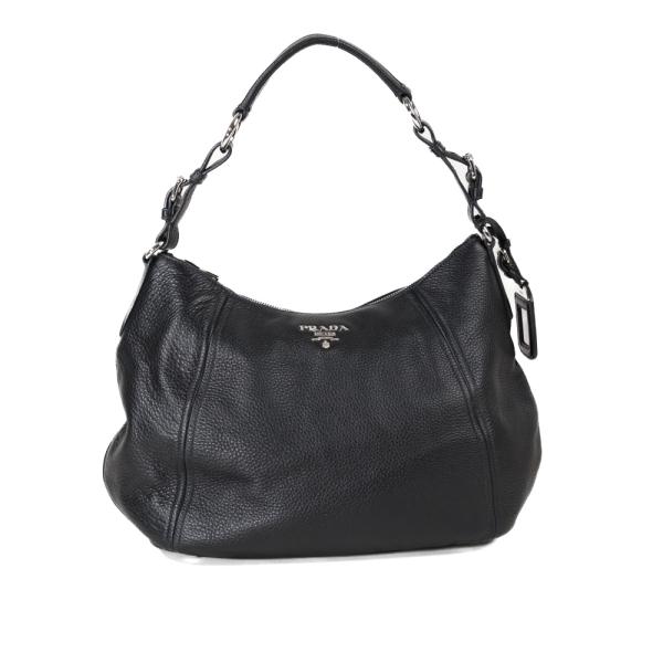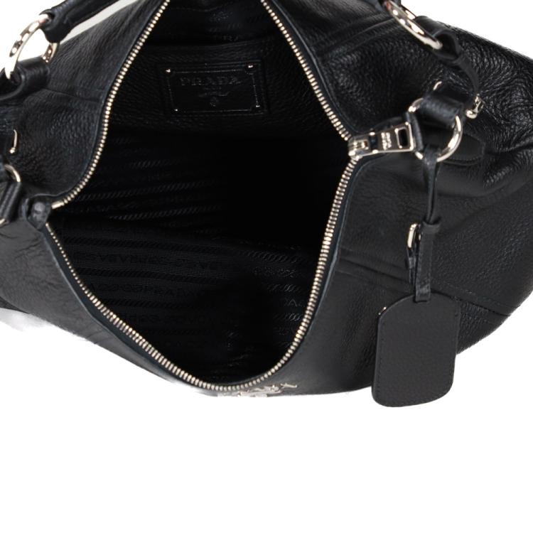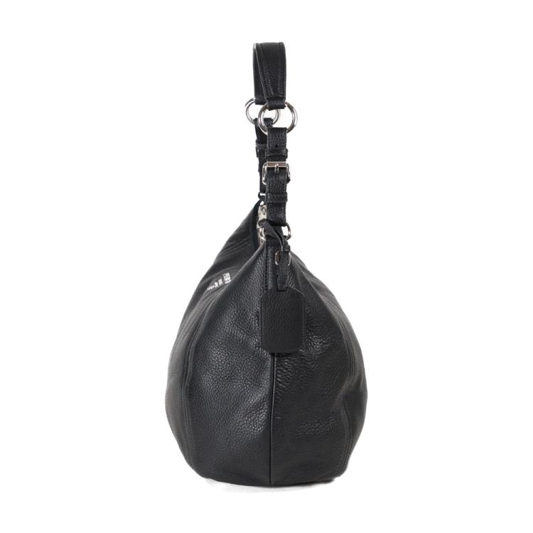 Prada softly structured hobo crafted bag in black rich pebbled-grained calf leather. Featuring silver-toned hardware, single adjustable top strap, metal lettering logo at front. The top zipper closure opens to a black logo printed nylon lining interior with zipper and patch pockets. Approximate dimensions: 31cm(L) x 23cm(H) x 15cm(D), 22cm shoulder strap drop. Accompanied by name tag, Prada certificate card and dustbag. With Entrupy Certificate of Authenticity. (Pre-owned)