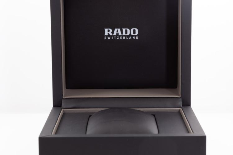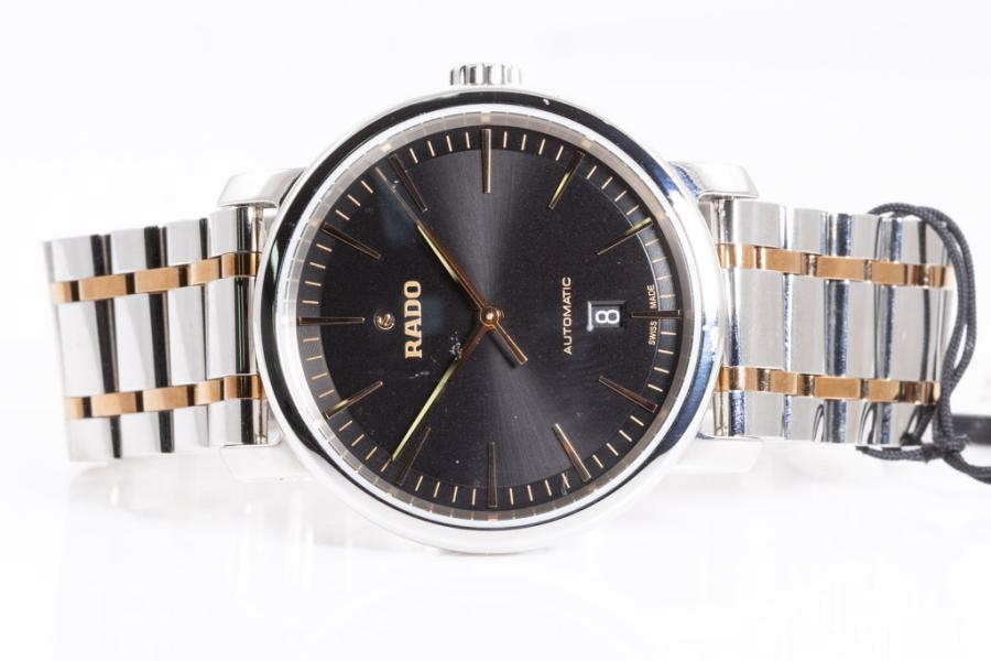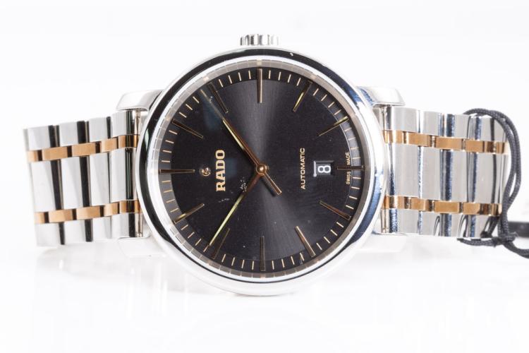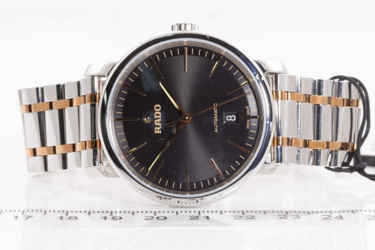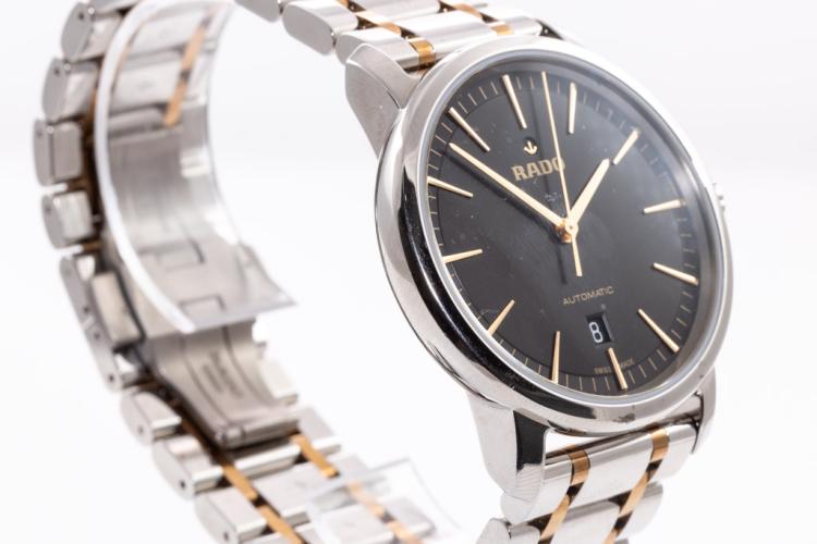 Rado Diamaster stainless steel automatic mens watch. Black dial, date, case diameter: 41mm, wrist size: 20cm, Swiss made. Ref# R14077163. With Rado two tone bracelet and clasp. With Rado 2 Year International Warranty Card and Rado box. Rado warranty applies. (As New, Note: minor scratches on case and light wear on strap due to being display stock)