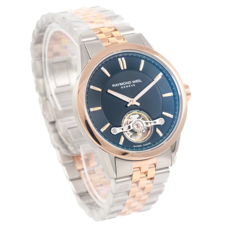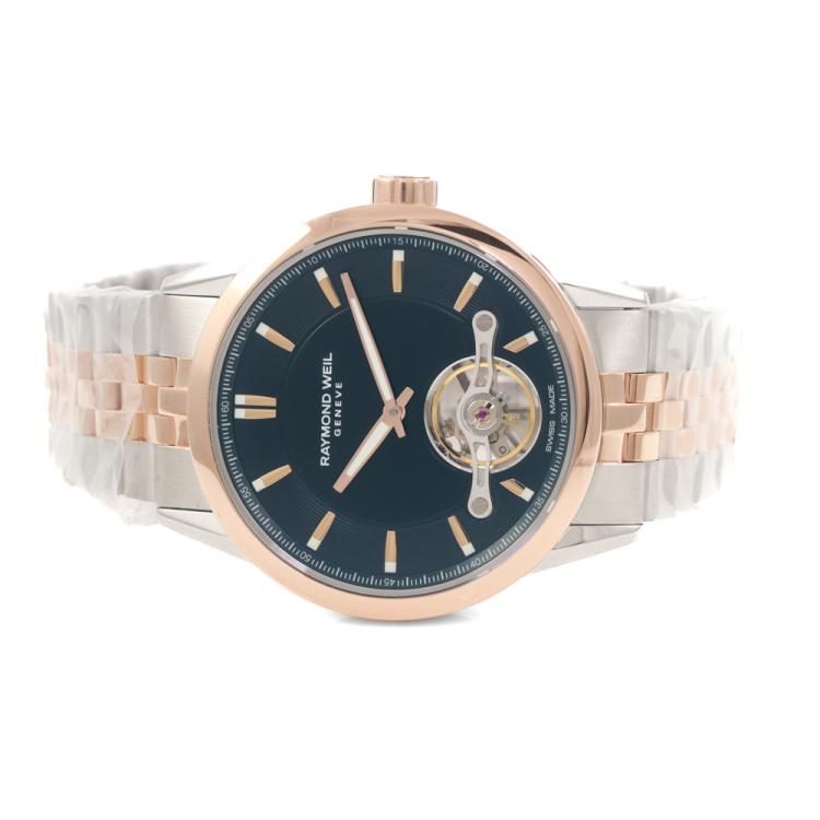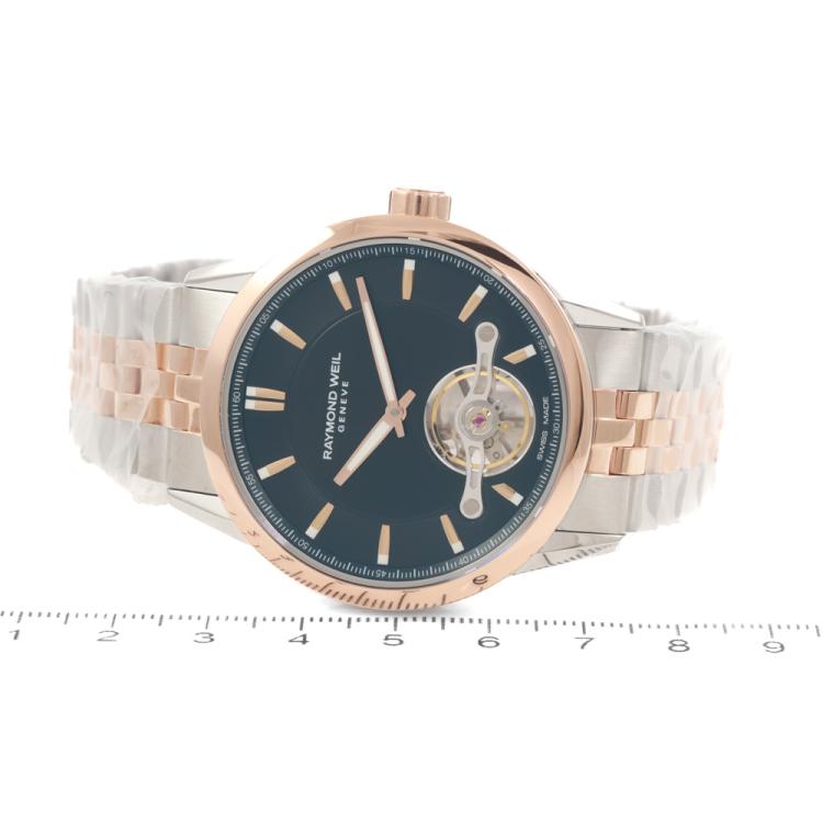 Raymond Weil Freelancer stainless steel and rose gold PVD plating automatic mens watch. Black dial, case diameter: 42.5mm, wrist size: 21cm, Swiss made. Ref# 2781-SP5-20051. With Raymond Weil two-tone bracelet and clasp. With Undated Raymond Weil Guarantee card and Raymond Weil box. 12 month FSA warranty. (As new: Note: case and bracelet on original wrap).