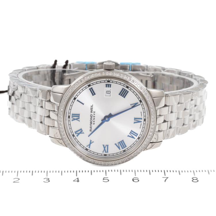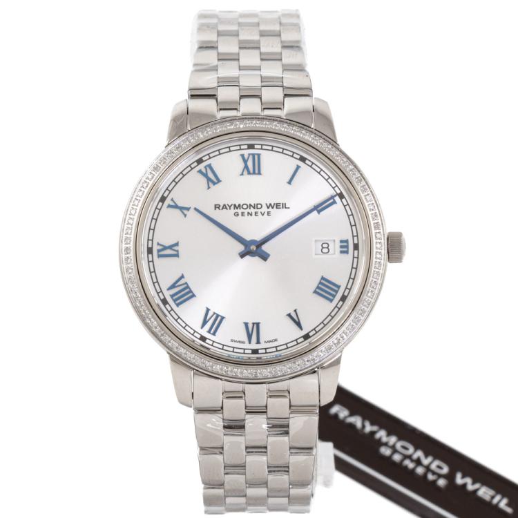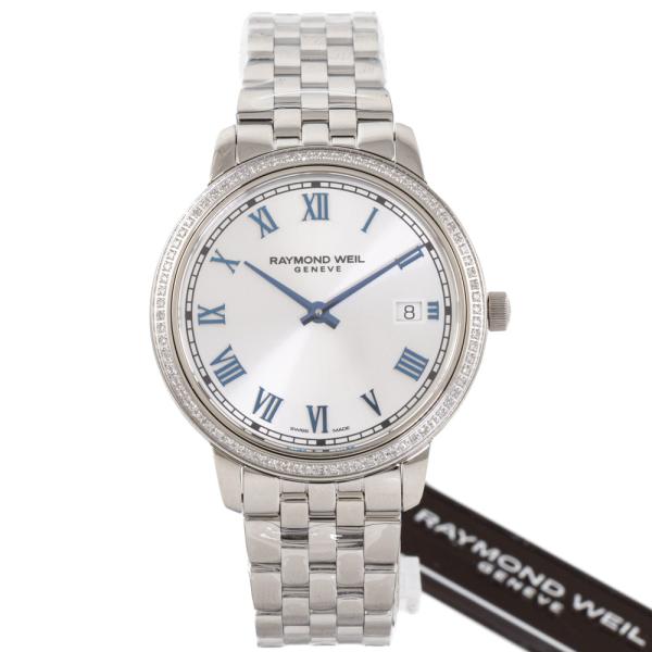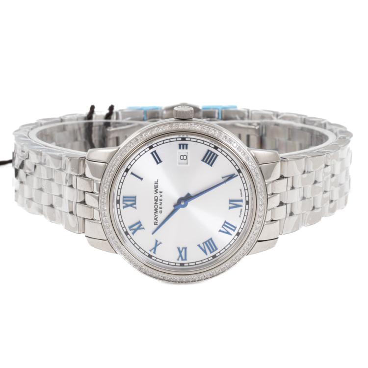 Raymond Weil Toccata stainless steel quartz ladies watch. Silver dial, Diamond set bezel, date, case diameter: 34mm, wrist size: 17.5cm, Swiss made. Ref# 5385-STS-00653. With Raymond Weil stainless steel bracelet and clasp. With Undated Raymond Weil Guarantee card, Raymond Weil Certificate of Authenticity and Raymond Weil box. 12 month FSA warranty (As new, Note: case and bracelet on original wrap)
