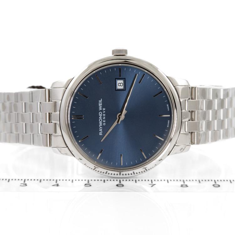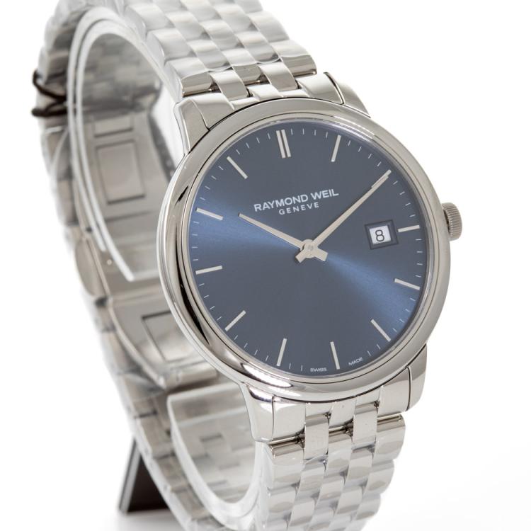 Raymond Weil Toccata stainless steel quartz mens watch. Blue dial, date, case diameter: 39mm, wrist size: 20.5cm, Swiss made. Ref#5485-ST-50001. With Raymond Weil stainless steel bracelet and clasp. With Undated Raymond Weil Guarantee card and Raymond Weil box. 12 month FSA warranty (As new, Note: case and bracelet in original wrapping)
