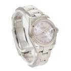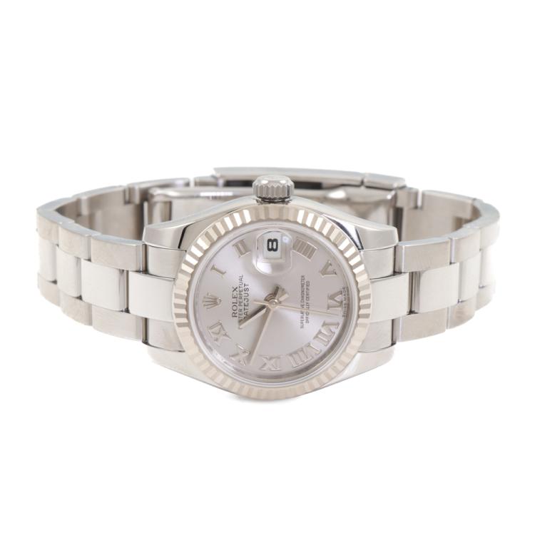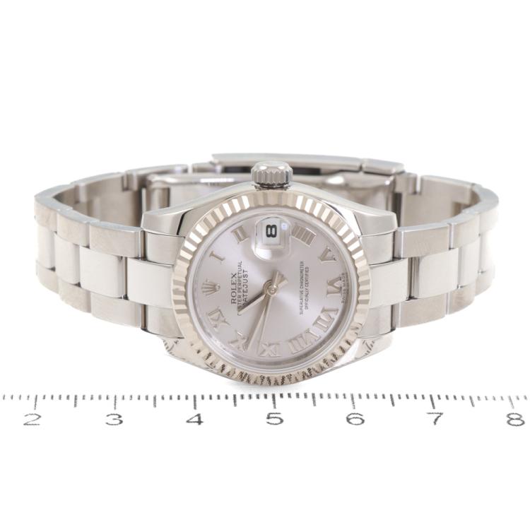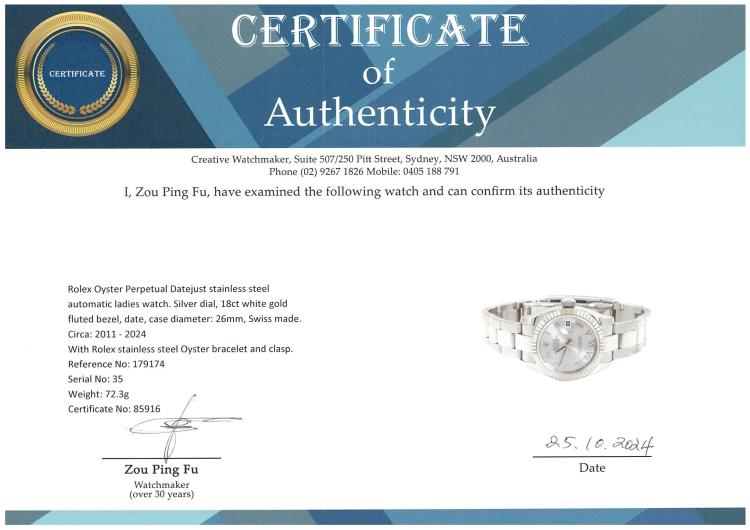 Rolex Oyster Perpetual Datejust stainless steel automatic ladies watch. Silver dial, 18ct white gold fluted bezel, date, case diameter: 26mm, wrist size: 16cm, Swiss made. Ref# 179174. Circa: 2011-2024. With Rolex stainless steel Oyster bracelet and clasp. With Certificate of Authenticity and Rolex box. 3 month FSA warranty (Pre-owned)