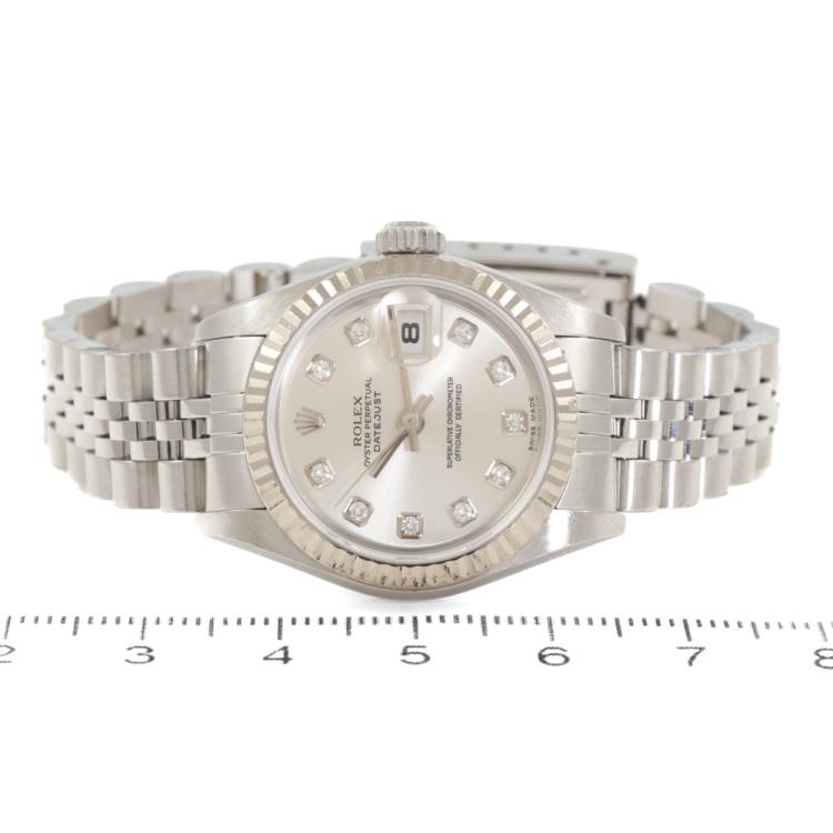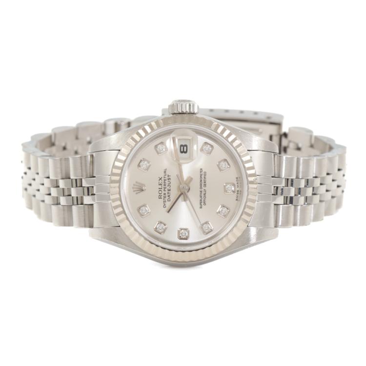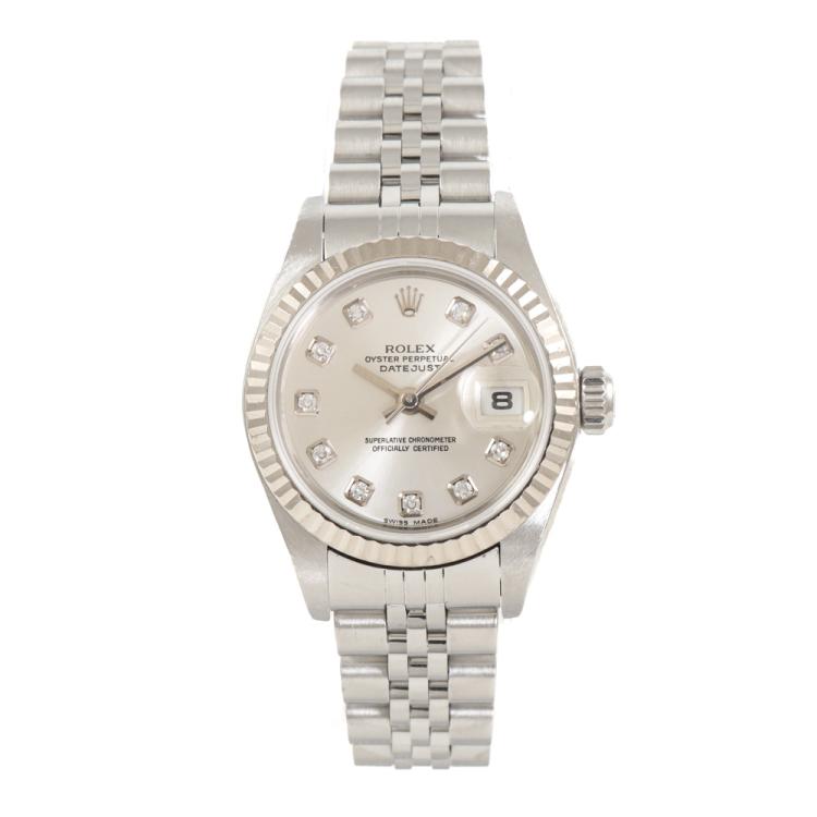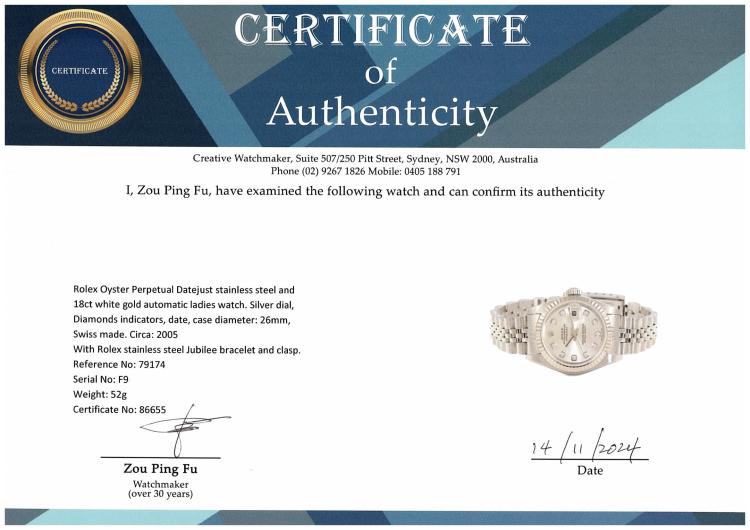 Rolex Oyster Perpetual Datejust stainless steel and 18ct white gold automatic ladies watch. Silver dial, Diamonds indicators, date, case diameter: 26mm, wrist size: 16cm, Swiss made. Ref# 79174. Circa: 2005. With Rolex stainless steel Jubilee bracelet and clasp. With Certificate of Authenticity, Rolex Guarantee Certificate dated 26/05/2005 and Rolex box. 3 month FSA warranty (Pre-owned)