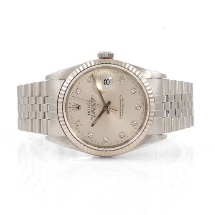 Rolex Oyster Perpetual Datejust 18ct white gold and stainless steel automatic mens watch. Silver dial, Diamond indicators, date, case diameter: 36mm, wrist size: 17.5cm, Swiss made. Ref# 16234G. Circa: 1991. With Rolex stainless steel Jubilee bracelet and clasp. With Certificate Authenticity and Rolex box. 3 month FSA warranty (Pre-owned)