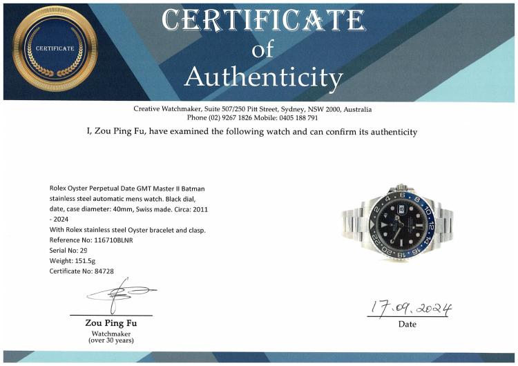 Rolex Oyster Perpetual Date GMT Master II Batman stainless steel automatic mens watch. Black dial, date, case diameter: 40mm, wrist size: 19.5cm, Swiss made. Ref# 116710BLNR, Circa: 2011 - 2024. With Rolex stainless steel Oyster bracelet and clasp. With Certificate of Authenticity, Rolex International Warranty Card dated 10/2013 and Rolex box and Rolex Gift bag. 3 month FSA warranty. (Pre-owned)