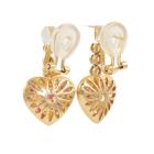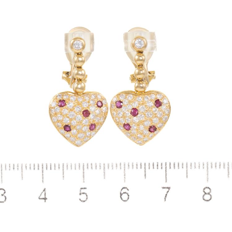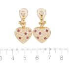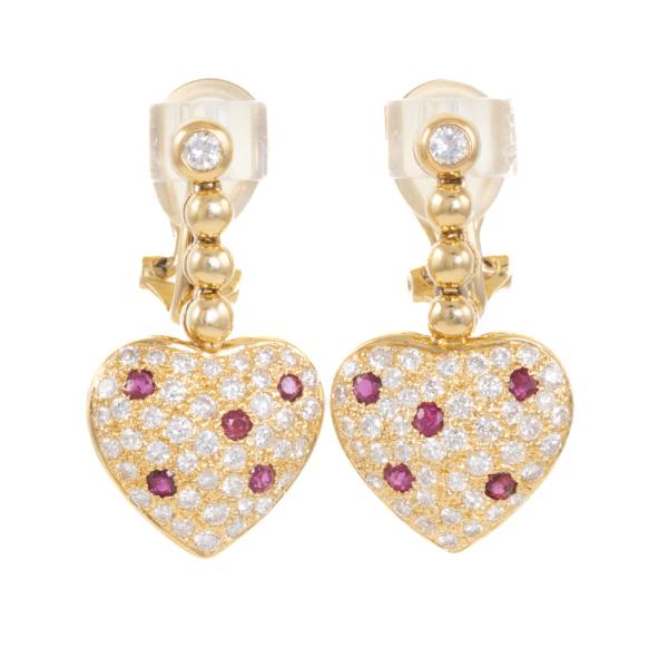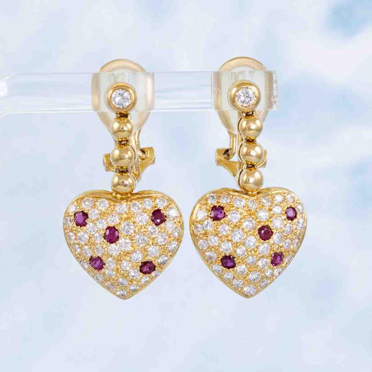 Heart design clip-on earrings (for pierced ears) with round natural Rubies totalling 0.43ct and round natural Diamonds totalling 1.07ct (Estimated grading: G-H SI). 18ct yellow gold. Weight: 10.1g. (Pre-owned)