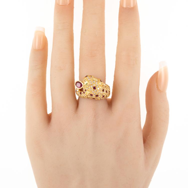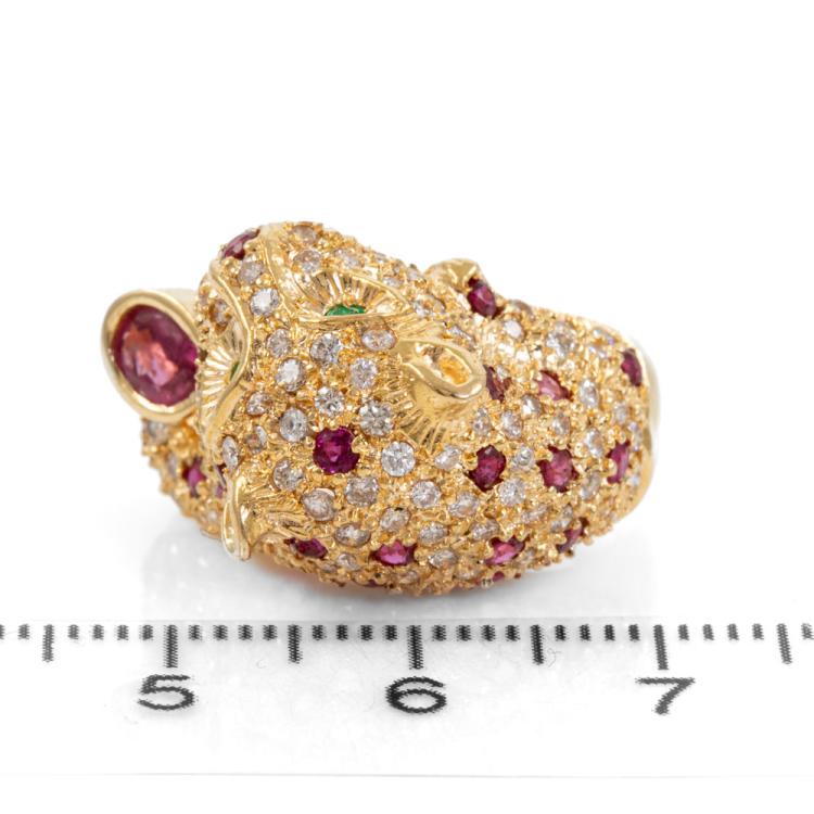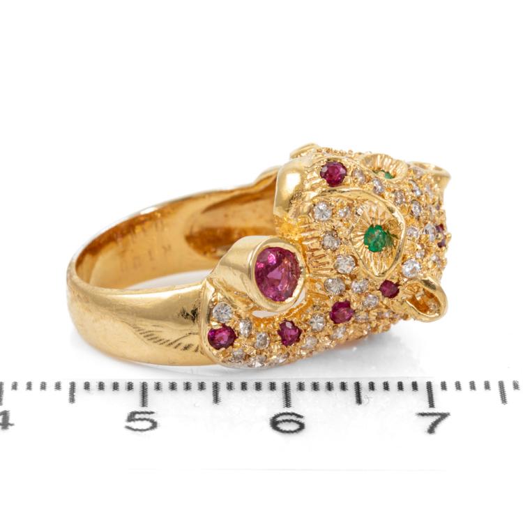 Panther designed ring with oval shape and round natural Rubies totalling 1.20ct, round natural Emerald totalling approximately 0.04ct and round natural Diamonds totalling 1.15ct (Estimated grading: H SI-P1). 18ct yellow gold. Ring size L1/2. Band width: 4.7mm- 7.3mm. Weight: 11.6g. (Pre-owned)