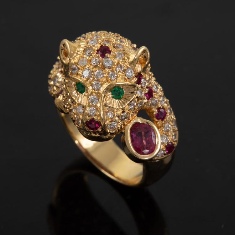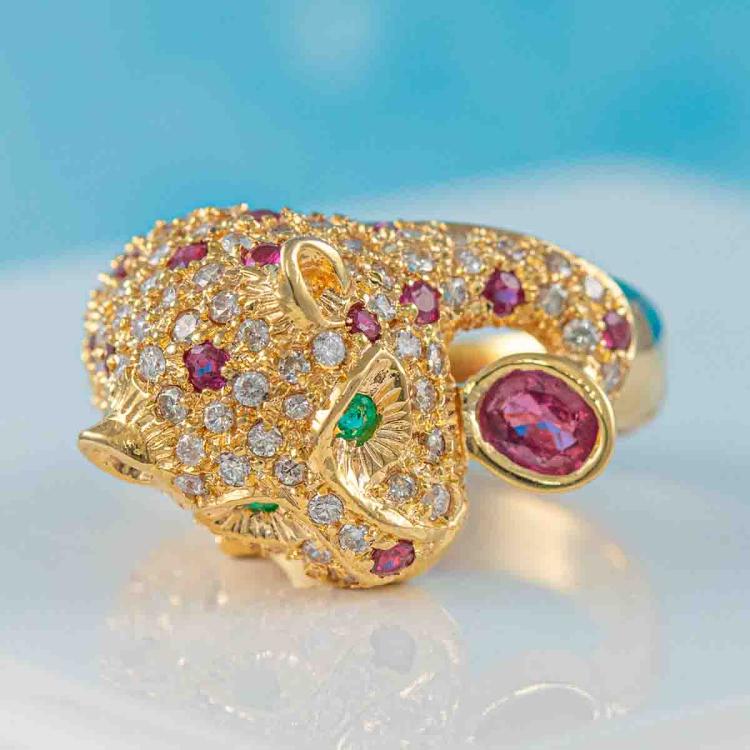 Ruby, Emerald and Diamond Panther Ring