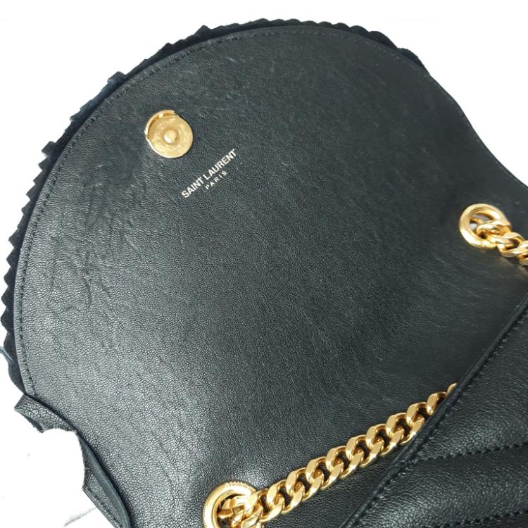 Saint Laurent Monogram Fringe half-moon shape crossbody bag in black calfskin leather. Featuring gold-toned hardware, rear exterior patch pocket, front flap with suede-leather fringe, and detachable chain shoulder strap. The magnetic closure opens to a black textile interior with patch pockets. Approximate dimensions: 21cm(L) x 16cm(H) x 6cm(D), strap drop 47cm. Accompanied by YSL dustbag. With Entrupy Certificate of Authenticity. (Pre-owned)