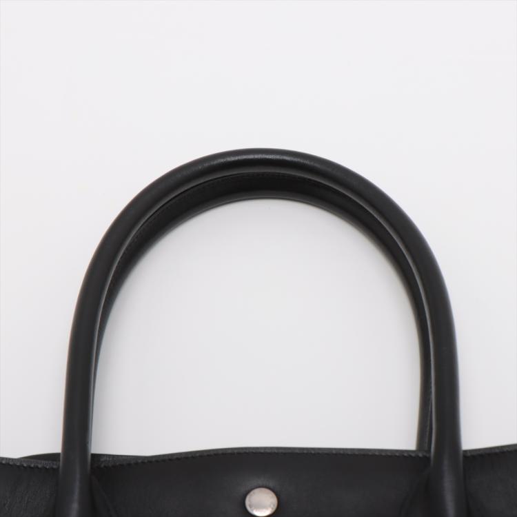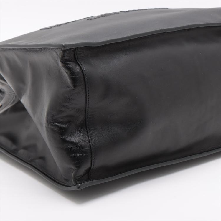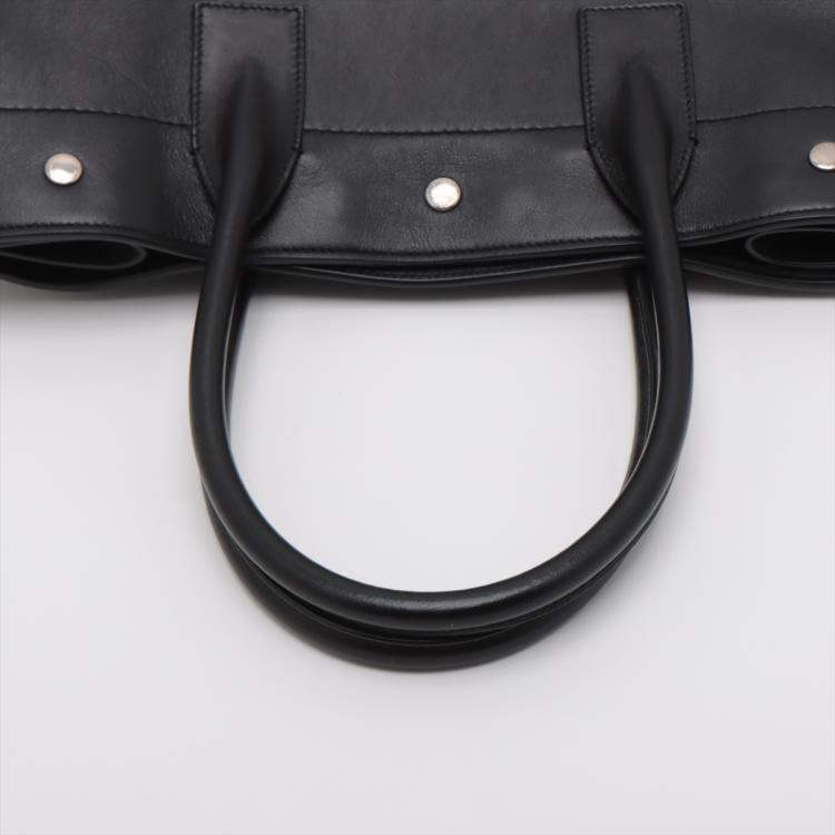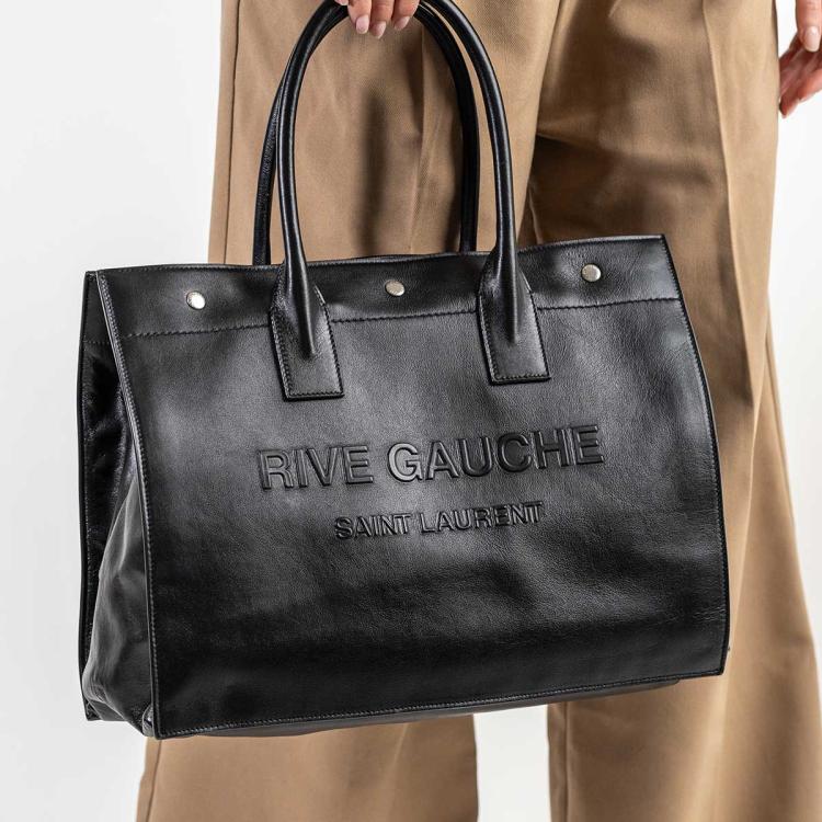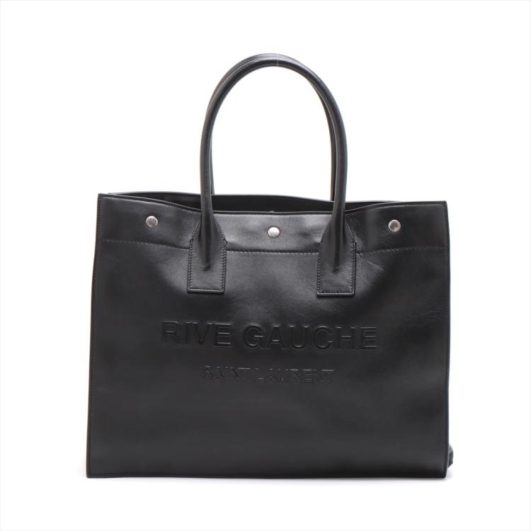 Saint Laurent Paris Rive Gauche large tote in black leather. Featuring an embossed leather logo at the front, dual leather handles, silver-toned metal hardware. The snap buttons along the top opens to a spacious black fabric lining and leather bottom interior with a zipper pocket. Approximate dimensions: 38.5cm(L) x 29.5cm(H) x 16.5cm(D), handle drop 15.5cm. Accompanied with a YSL dustbag. With Entrupy Certificate of Authenticity. (Pre-owned)