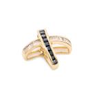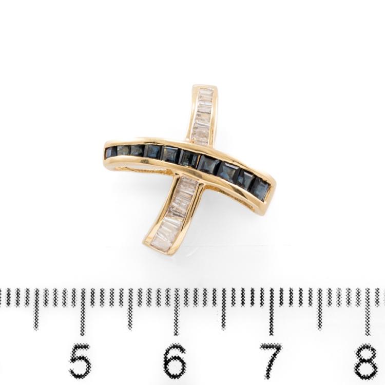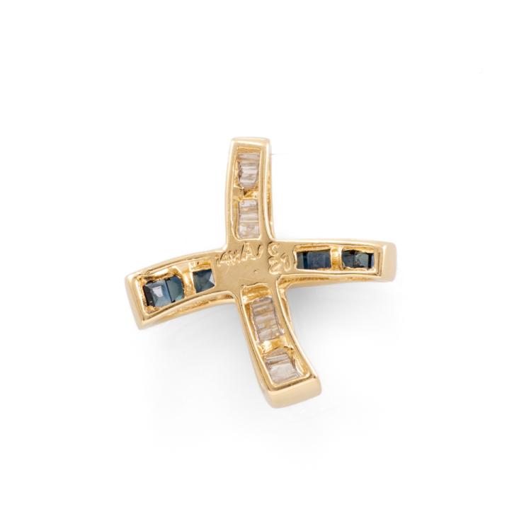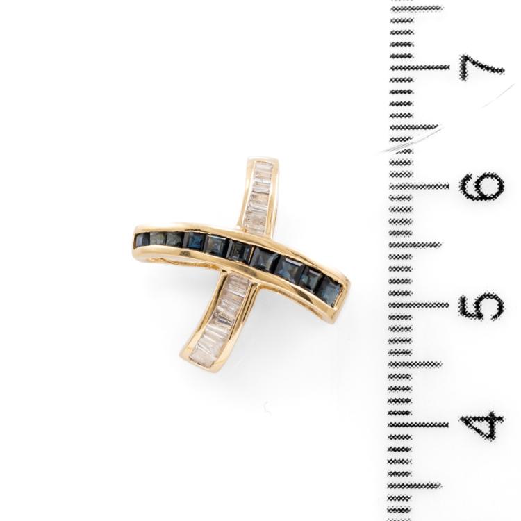 Sapphire and Diamond cross pendant with carre cut natural blue Sapphires totalling approximately 0.40ct and baguette cut natural Diamonds totalling 0.21ct. 14ct yellow gold. No chain provided. Weight: 2.1g. (Pre-owned)