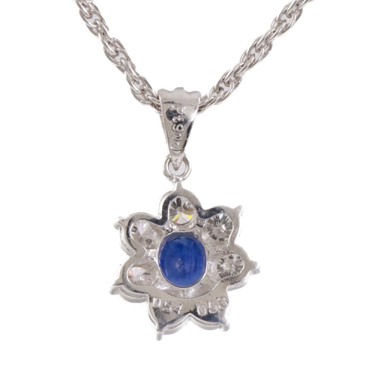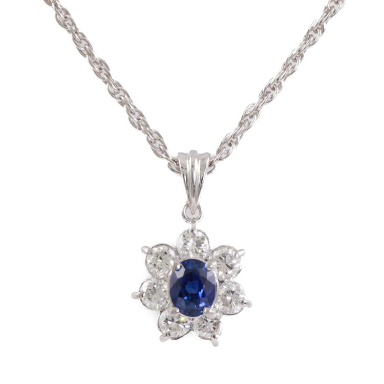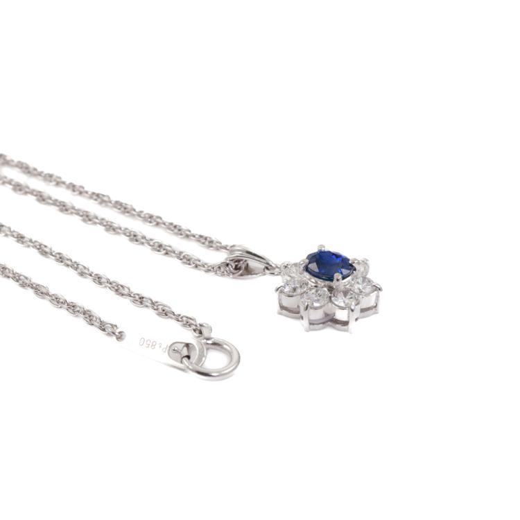 Sapphire and Diamond pendant with oval shape blue Natural Sapphire of 0.54ct and round Natural Diamonds totalling 0.53ct (Estimated grading: H-I SI). Platinum - 900 with 40cm Platinum 850 chain. Weight: 5.4g. (Pre-owned)