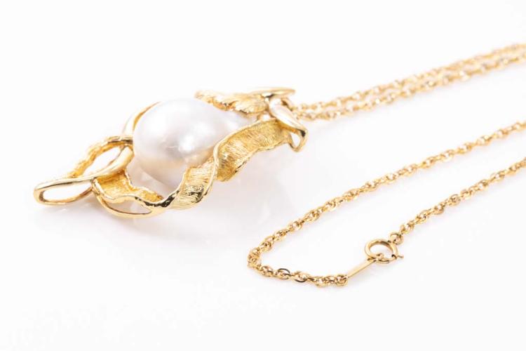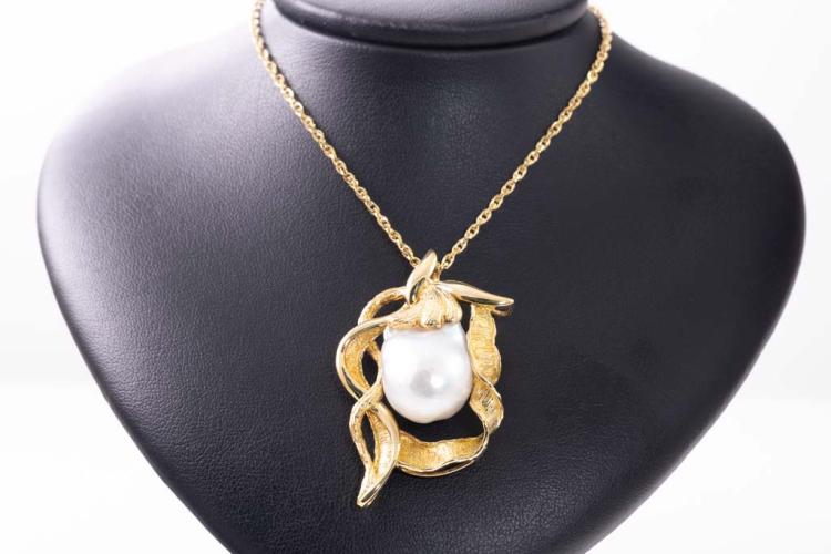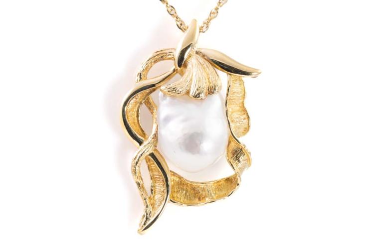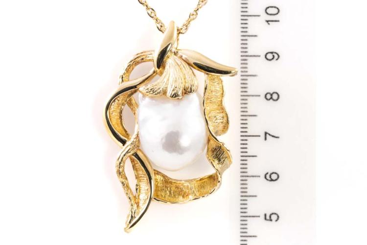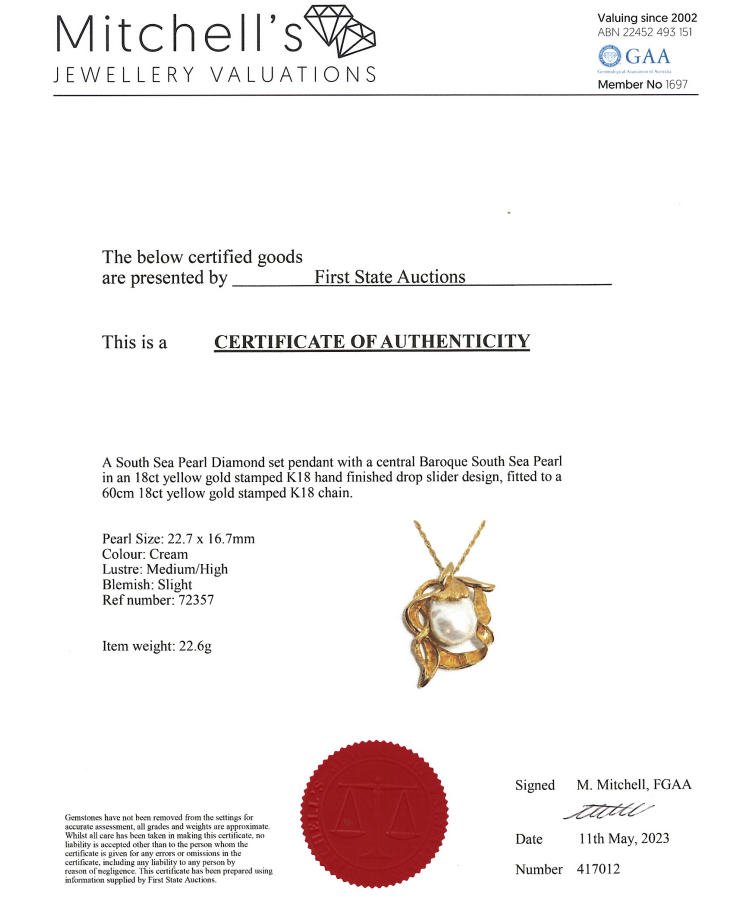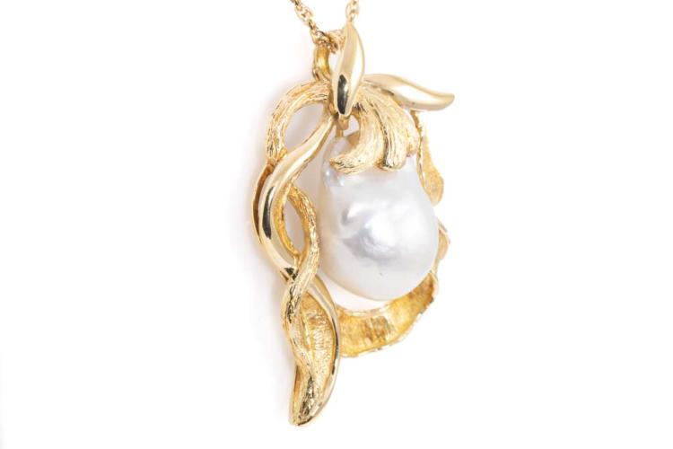Pearl pendant with Baroque South Sea Pearl of approximate 22.7mm x 16.7mm. 18ct yellow gold with 60cm 18ct yellow gold chain. Weight: 26.6g. With Certificate #417012. (Pre-owned)