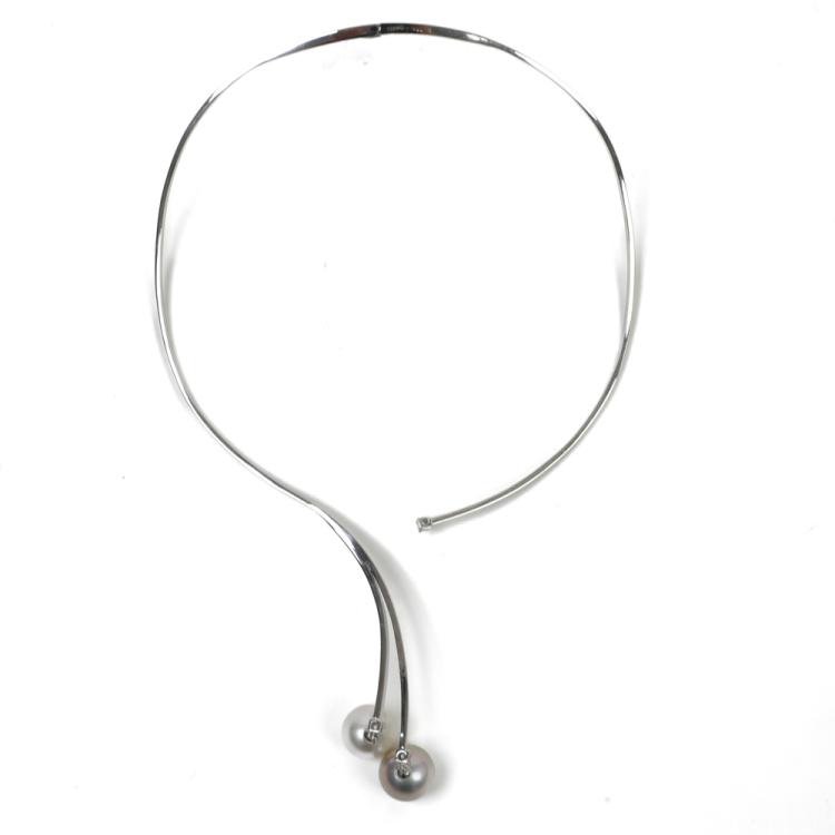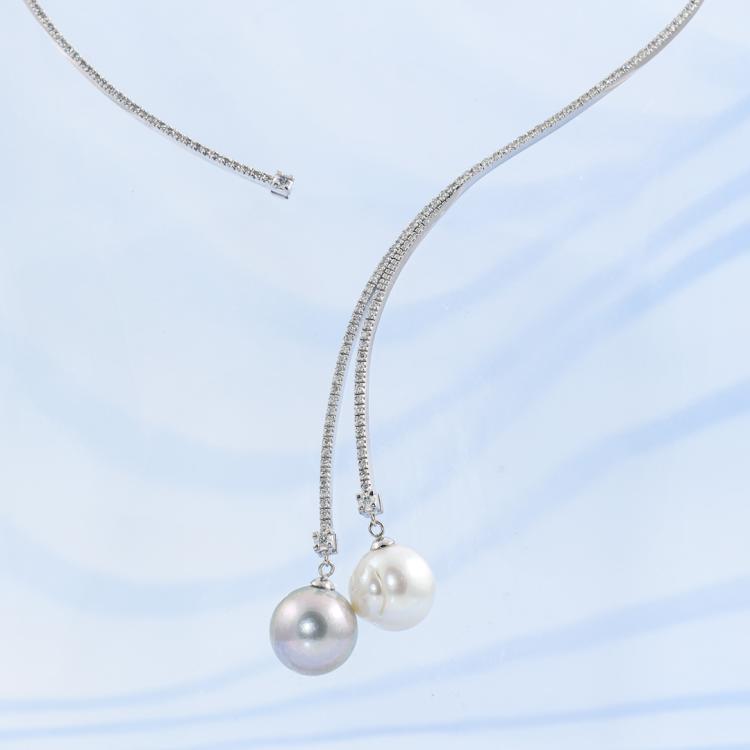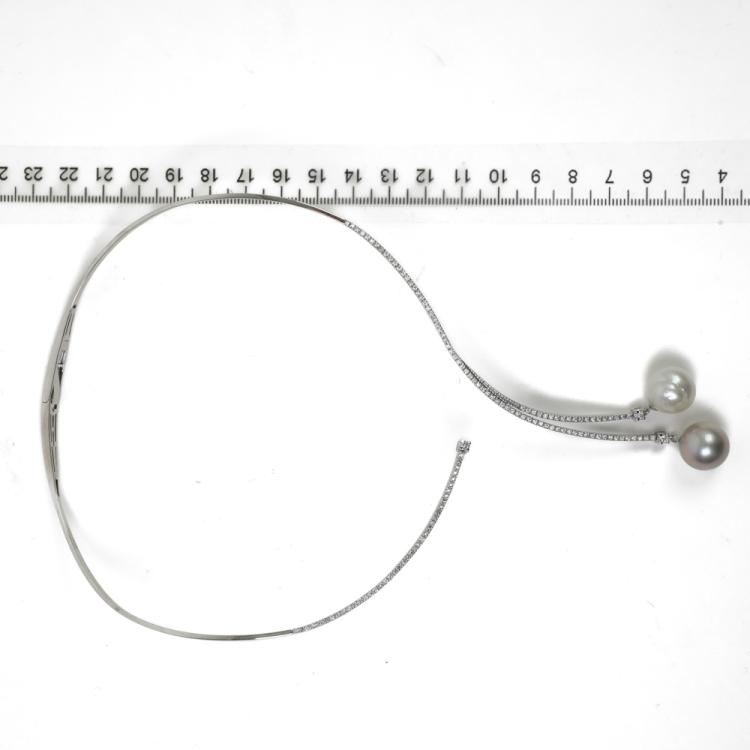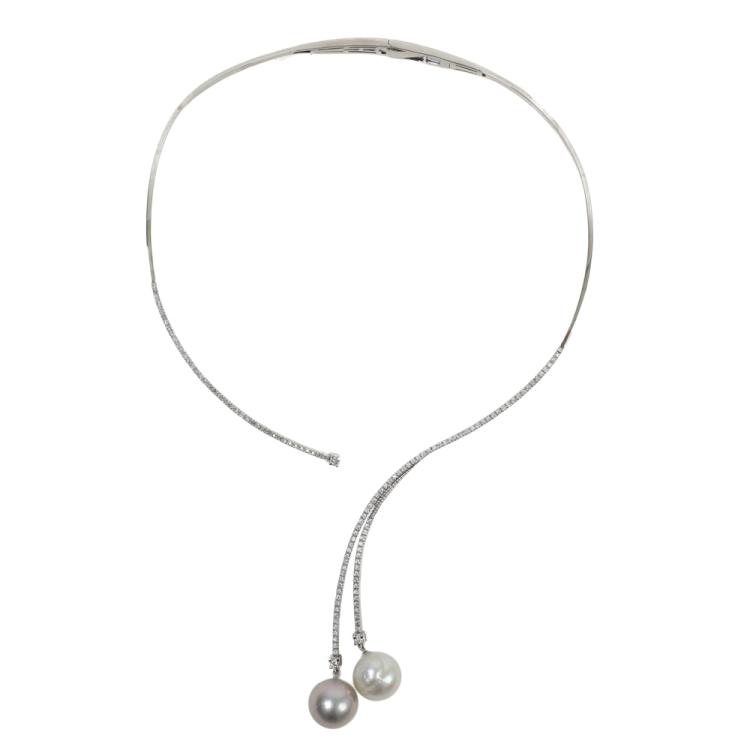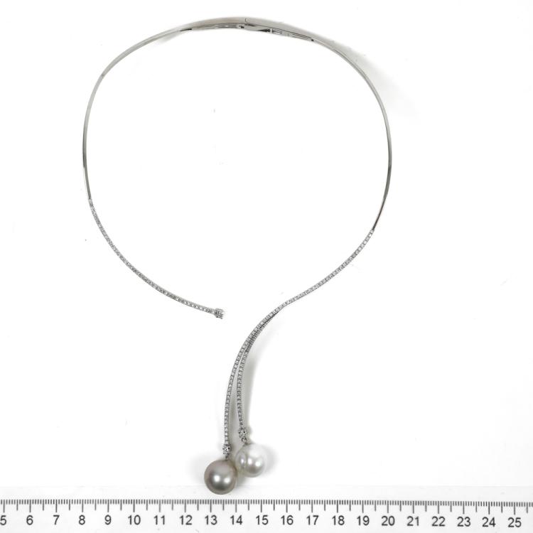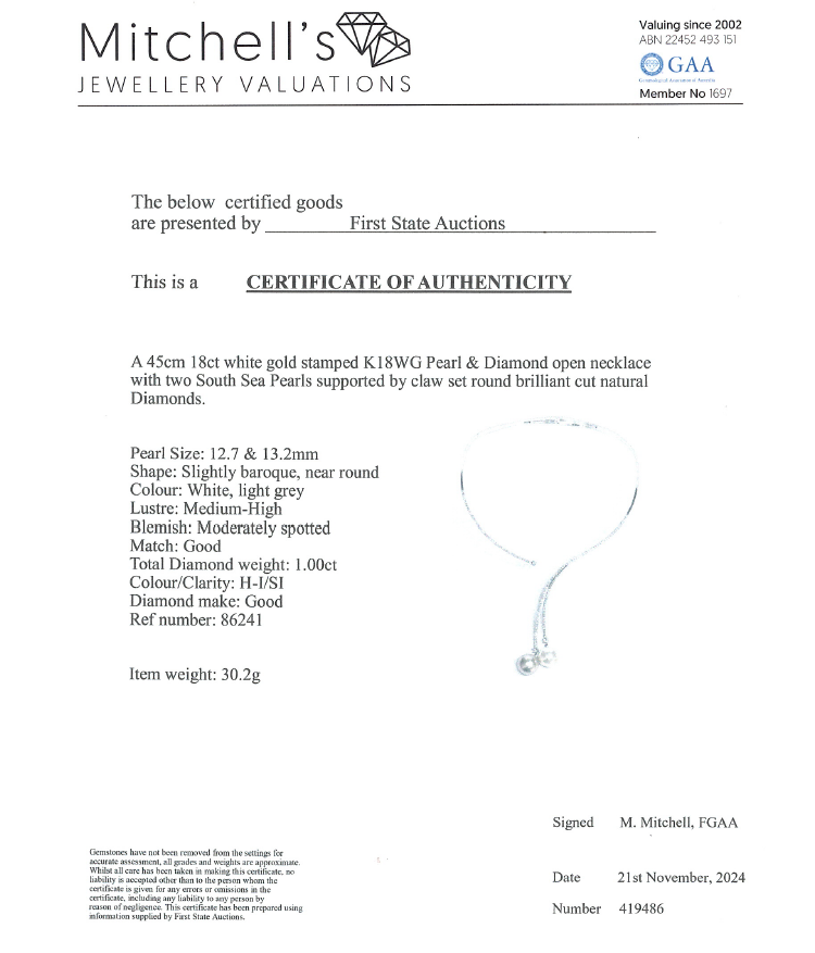 Pearl and Diamond open necklace with South Sea Pearl of 12.7mm & 13.2mm and round Natural Diamonds totalling 1.00ct (Estimated grading: H-I SI). 18ct white gold. Inner circumference: approximately 36.5cm. Weight: 30.2g. With Certificate #419486. (Pre-owned)