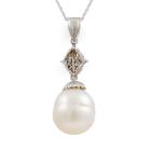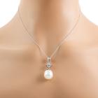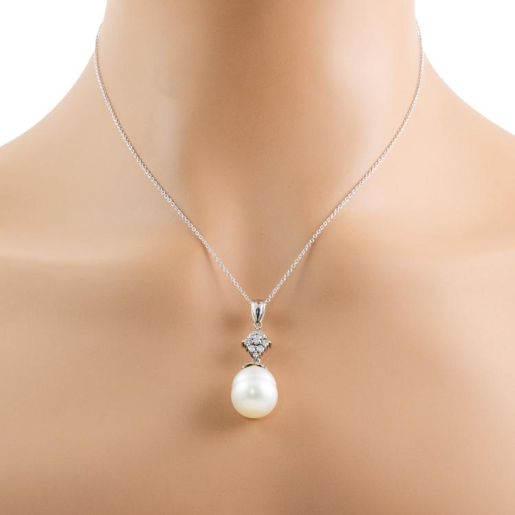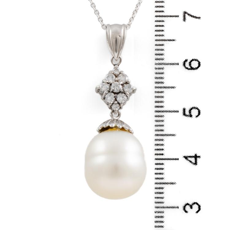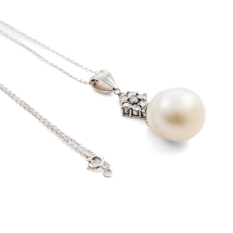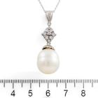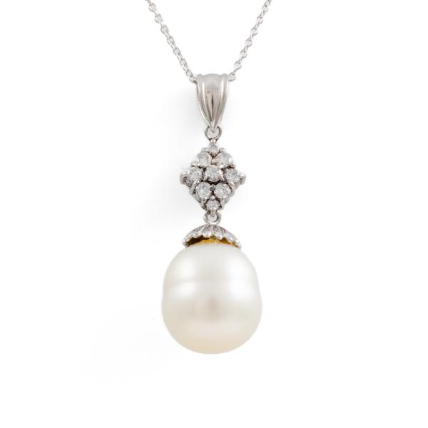 Pearl & Diamond pendant with a white South Sea Pearl of 12.9mm and round Natural Diamonds totalling 0.20ct. Platinum 900 with 14ct white gold 40cm chain. Weight: 7.3g. (Pre-owned)