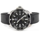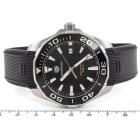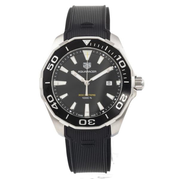 TAG Heuer Aquaracer stainless steel quartz mens watch. Black dial, date, case diameter: 43mm, wrist size: 20.5cm, Swiss made. Ref# WAY101A. With TAG Heuer black rubber strap and clasp. With Certificate of Authenticity and TAG Heuer box. 3 month FSA warranty. (Pre-owned)