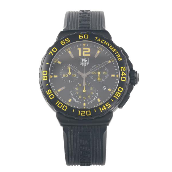 TAG Heuer Formula 1 titanium and stainless steel quartz mens watch. Black chronograph dial, date, case diameter: 42mm, adjustable max wrist size: 20.5cm, Swiss made. Ref# CAU111E. With TAG Heuer black rubber strap and clasp. With Certificate of Authenticity. 3 month FSA warranty (Pre-owned)