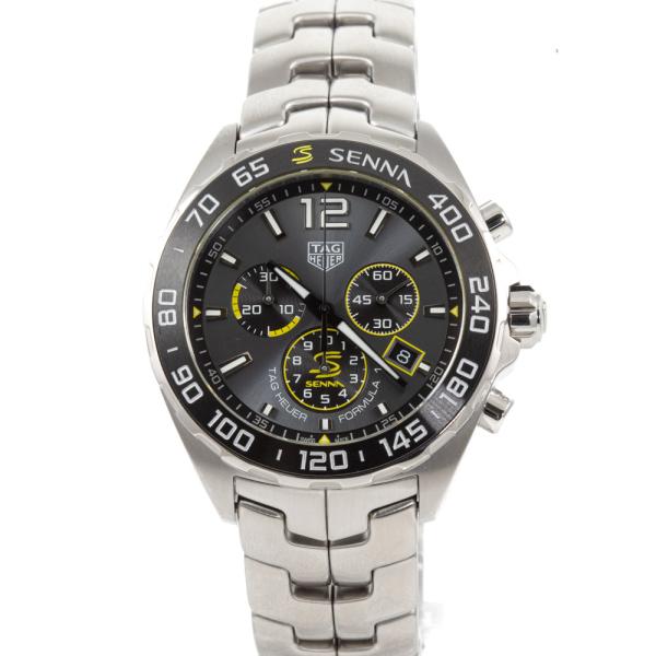 TAG Heuer Formula 1 x Senna stainless steel quartz mens watch. Grey chronograph dial, date, case diameter: 43mm, wrist size: 21.5cm, Swiss made. Ref# CAZ101AF.BA0637. With TAG Heuer stainless steel bracelet and clasp. With Certificate of Authenticity, TAG Heuer International warranty card dated 09/01/2021 and TAG Heuer box. 3 month FSA warranty (Pre-owned)