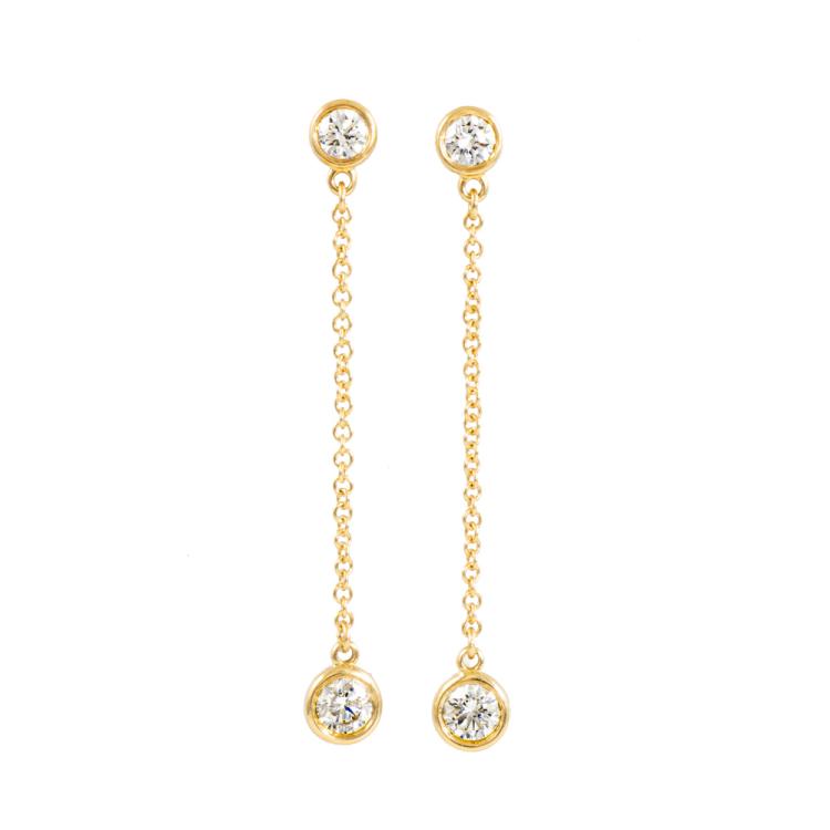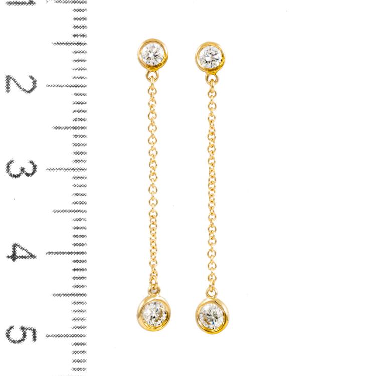 Tiffany & Co Elsa Peretti Diamonds by the Yard Drop Earrings with 4 round Natural Diamonds totalling 0.39ct (Estimated grading: F VS). 18ct yellow gold with 18ct yellow gold Tiffany & Co backs. Drop length: 3.4cm. Weight: 1.4g. With Tiffany & Co box. (Pre-owned)