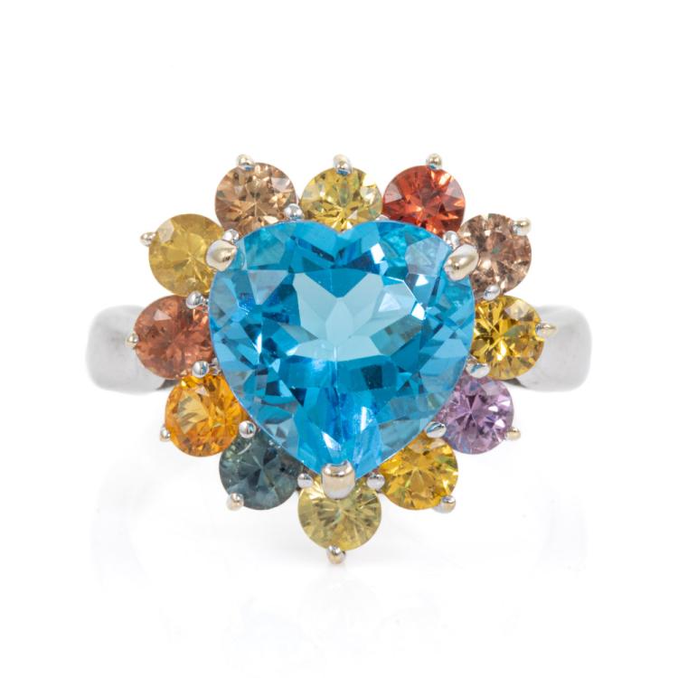 Topaz and Sapphire Ring with heart shape Natural blue Topaz of 4.32ct and surrounding round Natural multi-coloured Sapphires totalling 1.07cts. 18ct white gold. Ring size L. Band width: 2.7mm - 2.3mm. Weight: 6.4g. (Pre-owned)