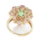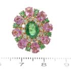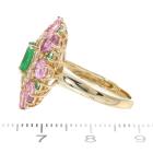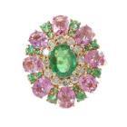 Tsavorite, Sapphire and Diamond ring with oval & round natural Tsavorite Garnet of approximately 1.10ct, oval shape pink Natural Sapphires totalling approximately 3.00ct and round Natural Diamonds totalling approximately 0.24ct. 18ct yellow gold. Ring size M1/2. Width: 2.0mm-3.6mm. Weight: 5.6g. (Pre-owned)