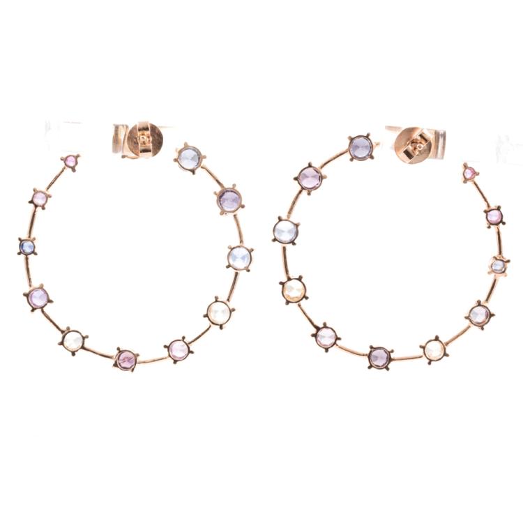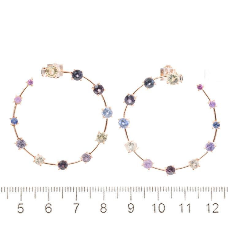 Hoop earrings with round multi-colour Ceylonese Natural unheated Sapphires totalling 5.50ct (only two sapphires tested) and 2 baguette cut Natural Diamonds totalling 0.06ct. 14ct rose gold. Weight: 6.3g. With GGTL report #209457. (As new)
