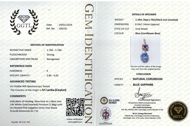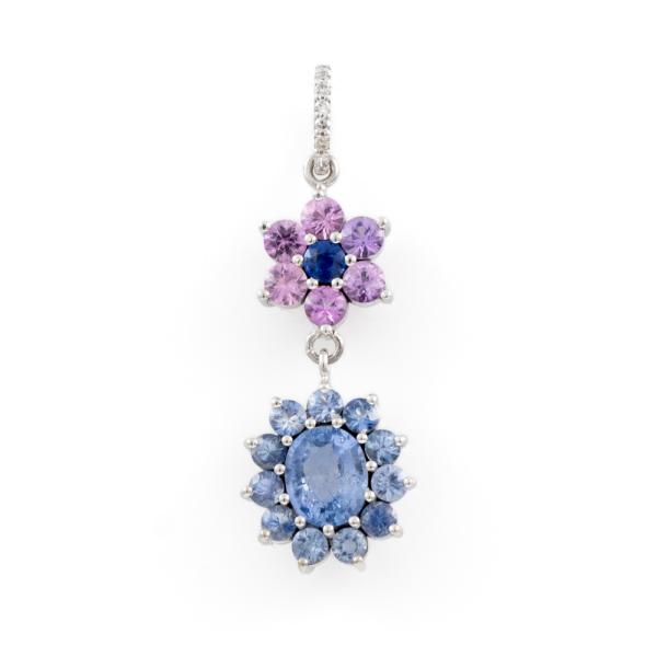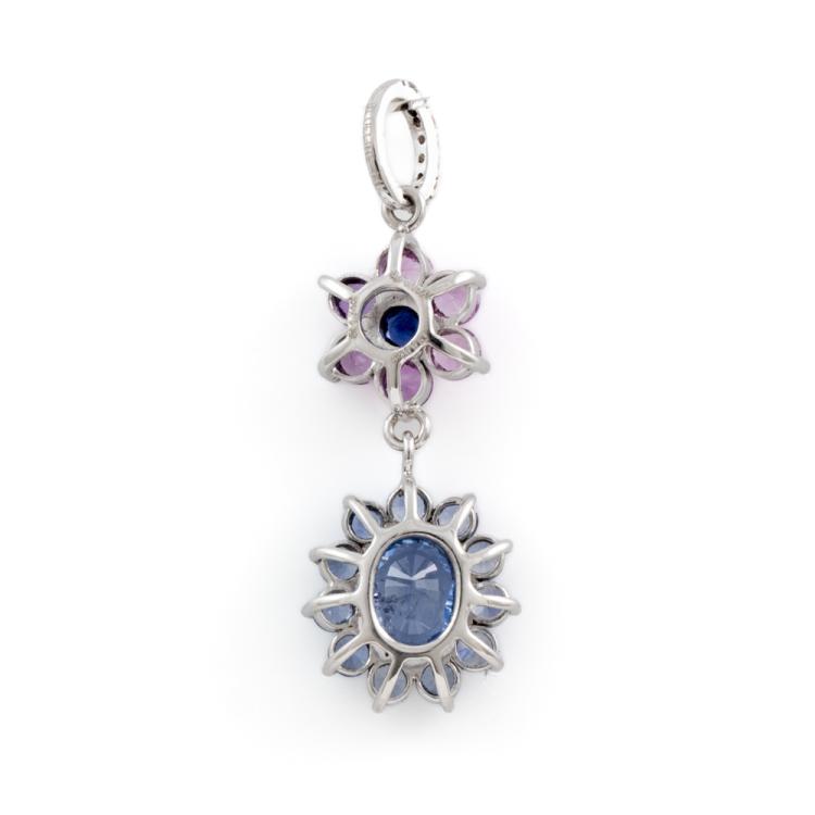 Sapphire and Diamond pendant with an oval shape blue Natural Ceylon Sapphire of 1.19ct, round blue & pink (unheated - only one stone tested) Natural Sapphires totalling 1.74cts and round Natural Diamonds totalling 0.11cts. 14ct white gold. Length: 3.7cm. No chain provided. Weight: 2.8g. With GGTL report #206191. (As new)
