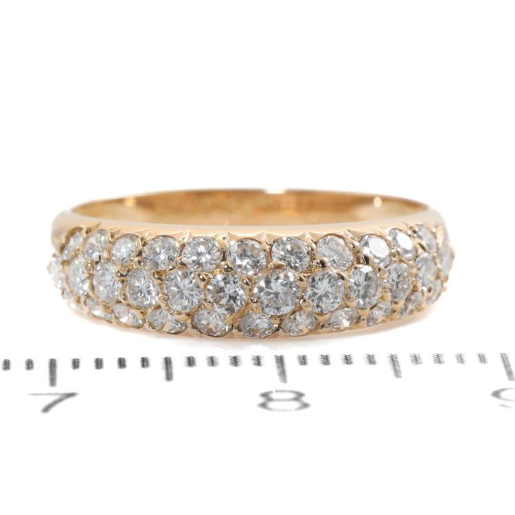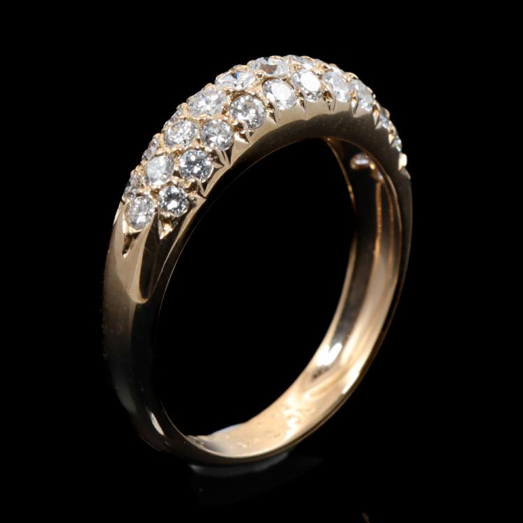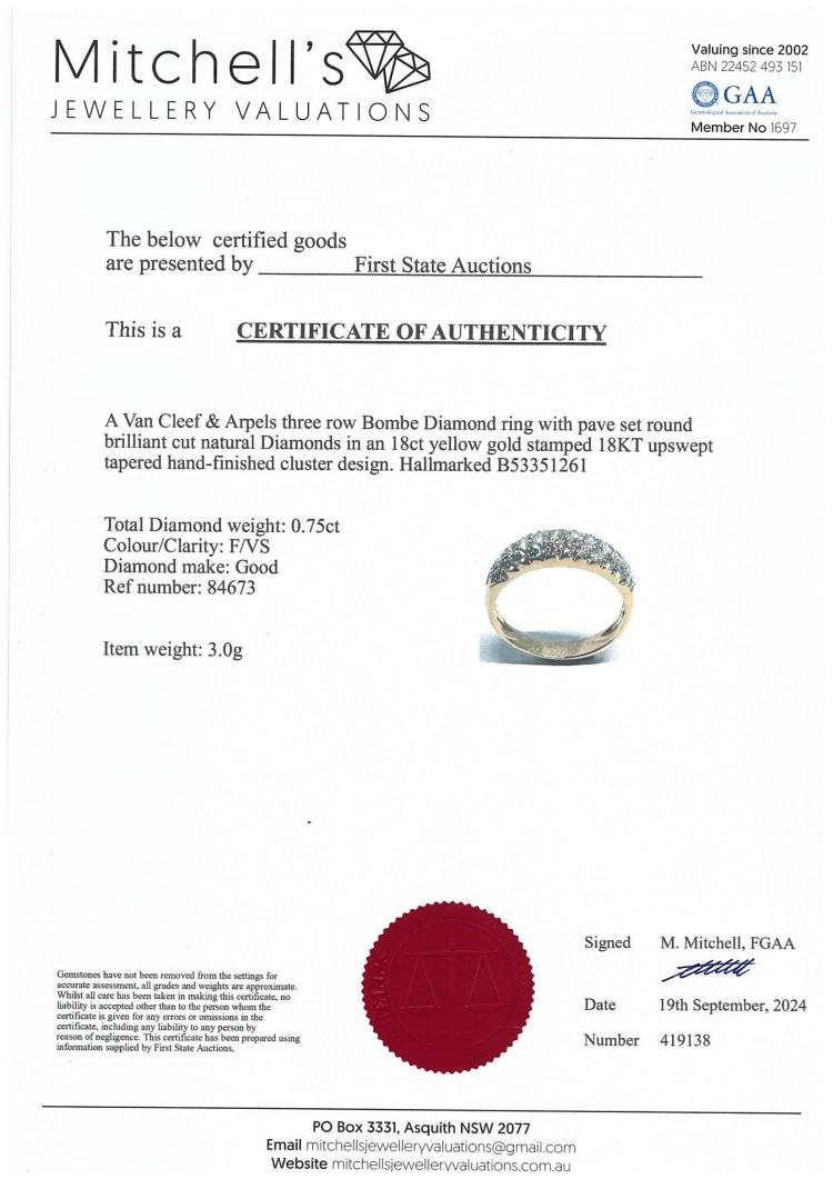 Van Cleef & Arpels Diamond 3 row Bombe ring with round Natural Diamonds totalling 0.75ct (Estimated grading: F-G VS). 18ct yellow gold. Ring size L - ring resizing is not recommended. Band width: 3.1mm - 3.7mm. Weight: 3.0g. With Certificate #419138. (Pre-owned)